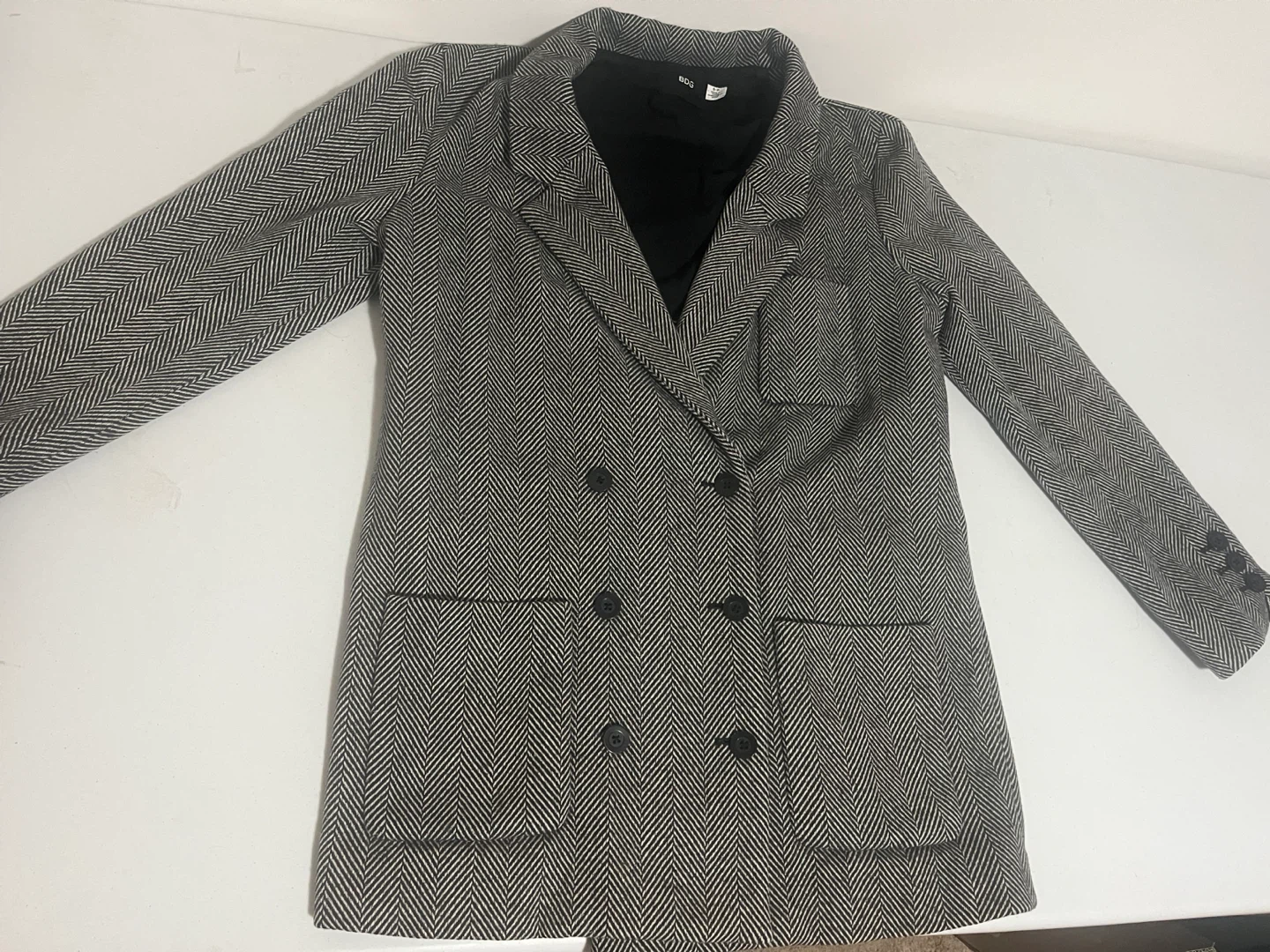 Selling a stylish BDG blazer in a classic herringbone pattern! It's a size small and features a double-breasted design. Perfect for adding a touch of sophistication to any outfit
