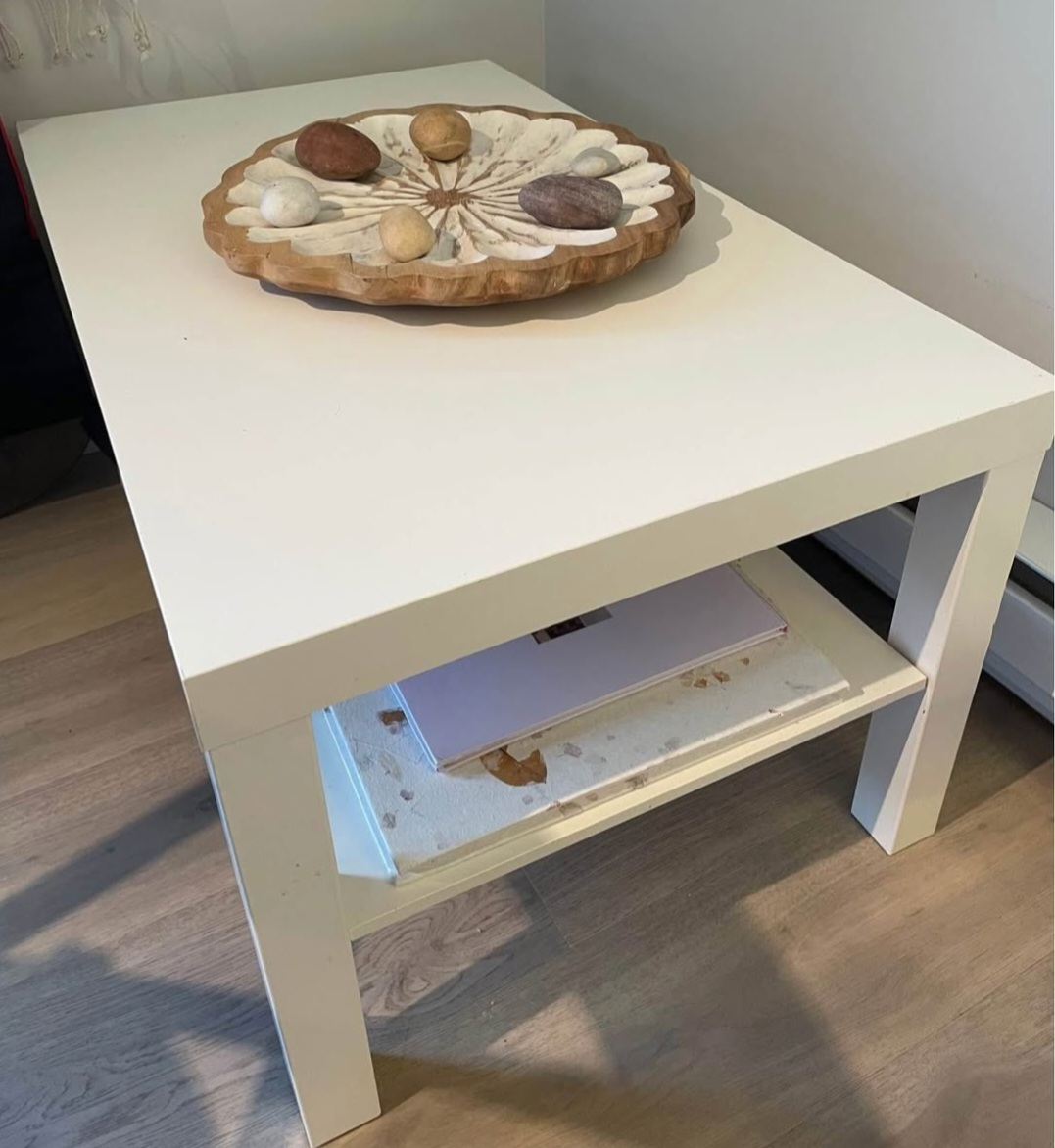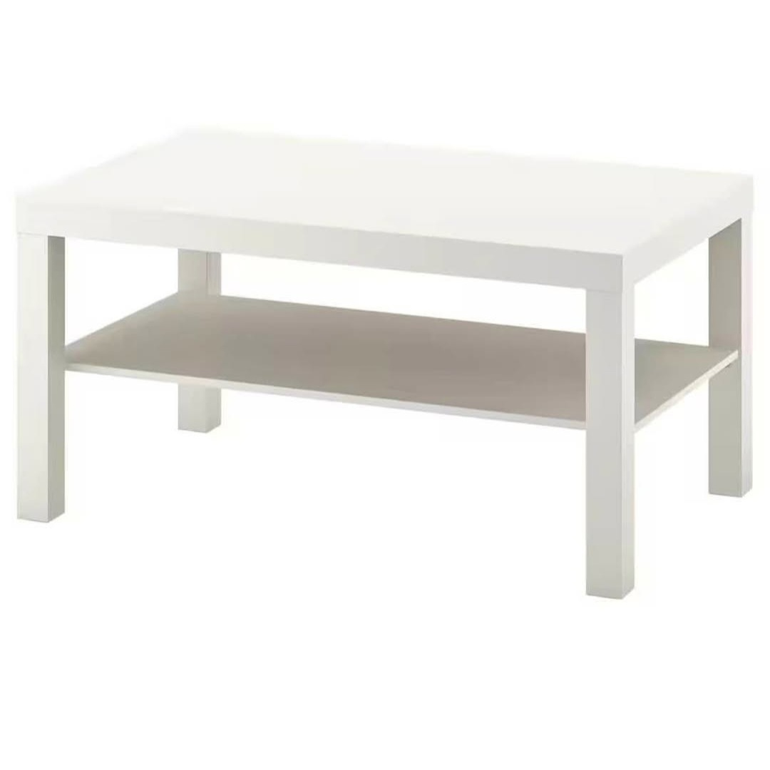 White coffee table with a lower shelf. Simple design, great for small spaces. Minimalist style. Easy to assemble and disassemble.