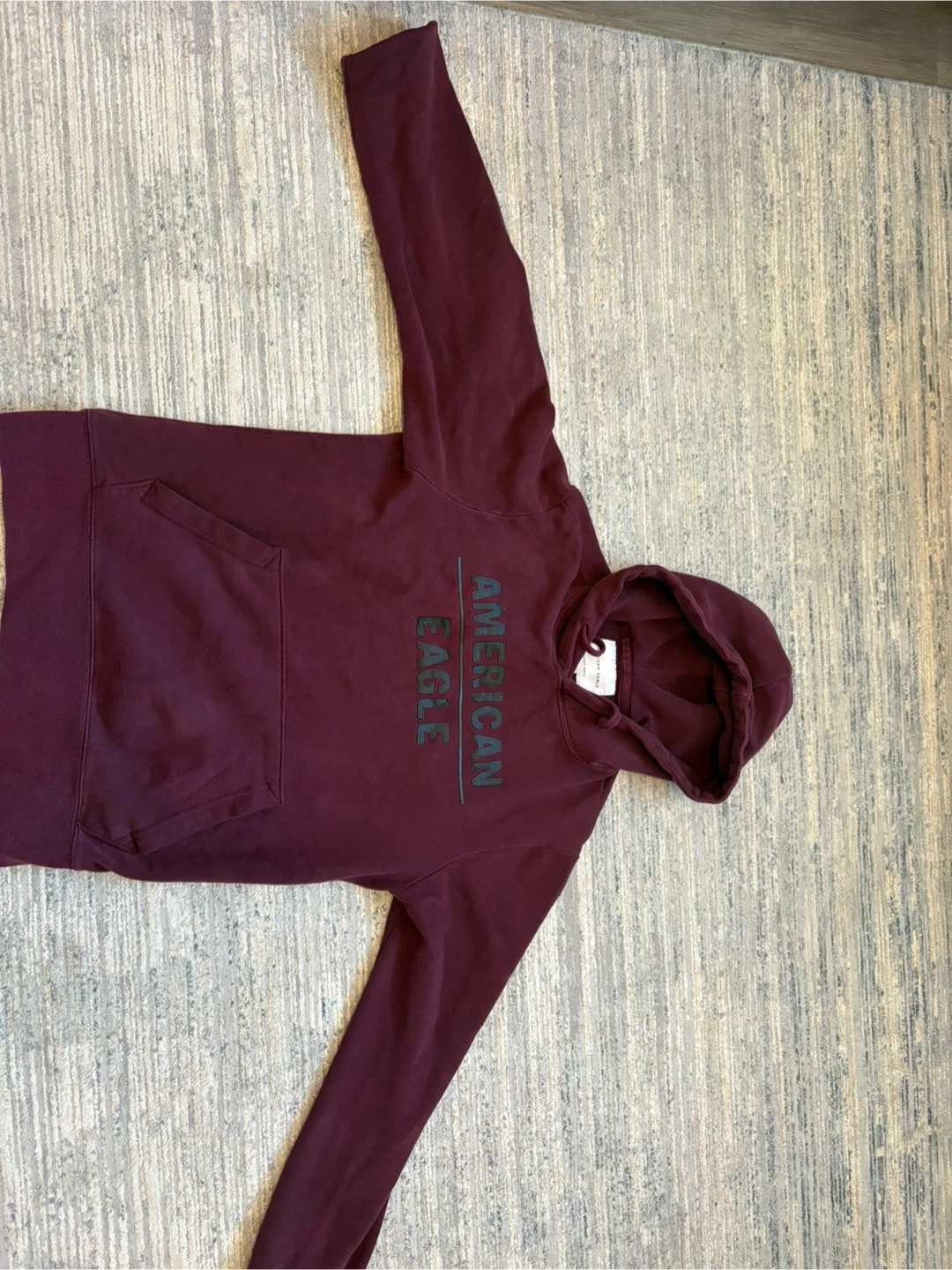 Burgundy hoodie with the American Eagle logo printed on the front. It has a front pocket and a hood. Cotton blend material. Also text for more details