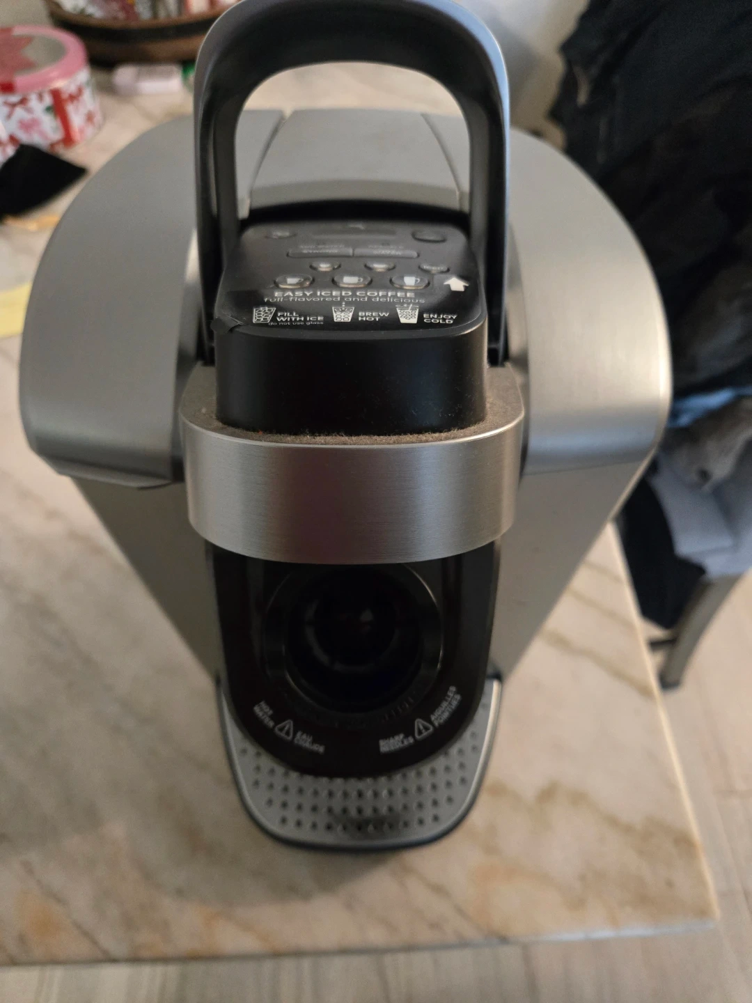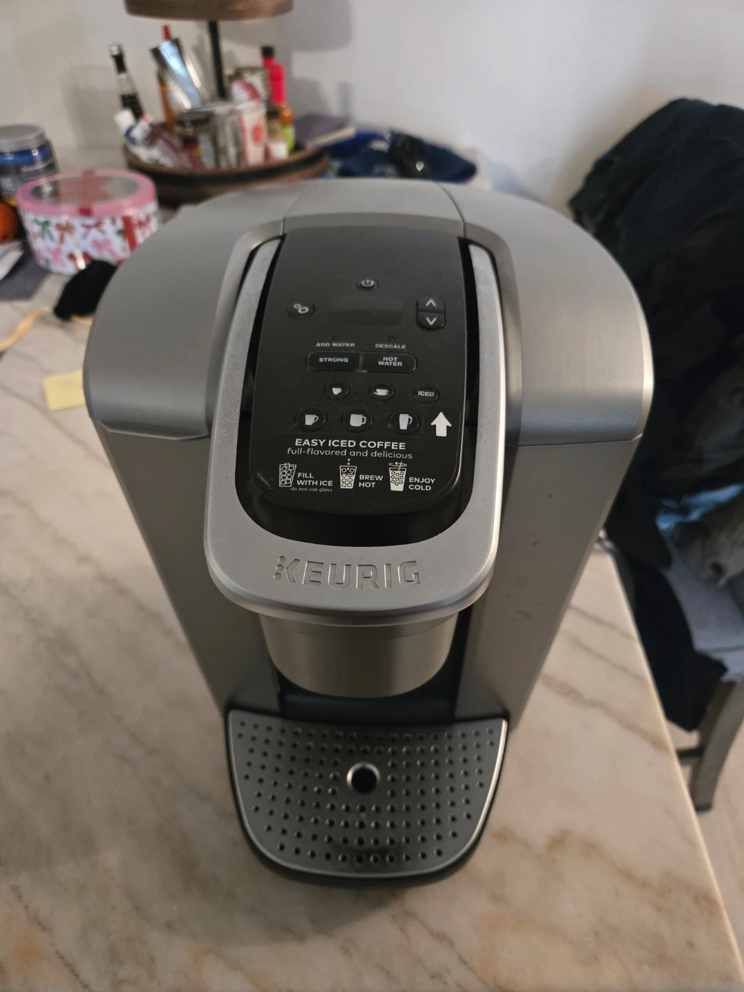 This Keurig K-Select coffee maker brews hot or iced beverages. It offers strong brew options and a water reservoir. A removable drip tray is included.