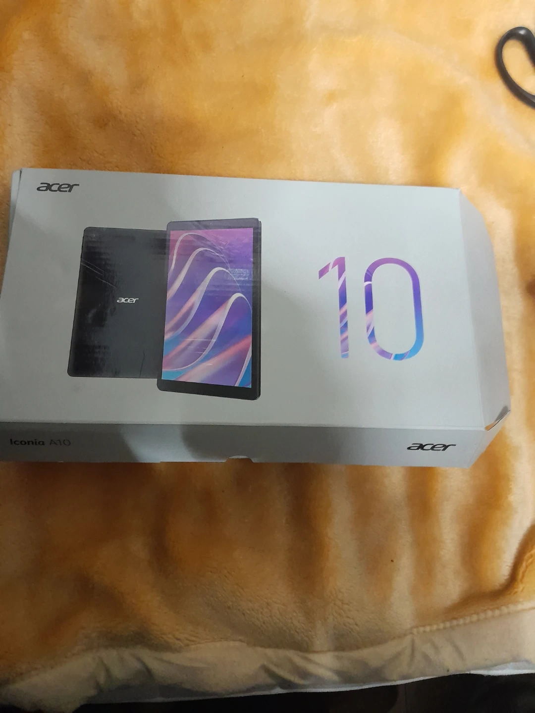 Selling an Acer Iconia A10 tablet in silver. It has 32 GB of storage and Wi-Fi connectivity. The box includes the tablet itself and the charger.