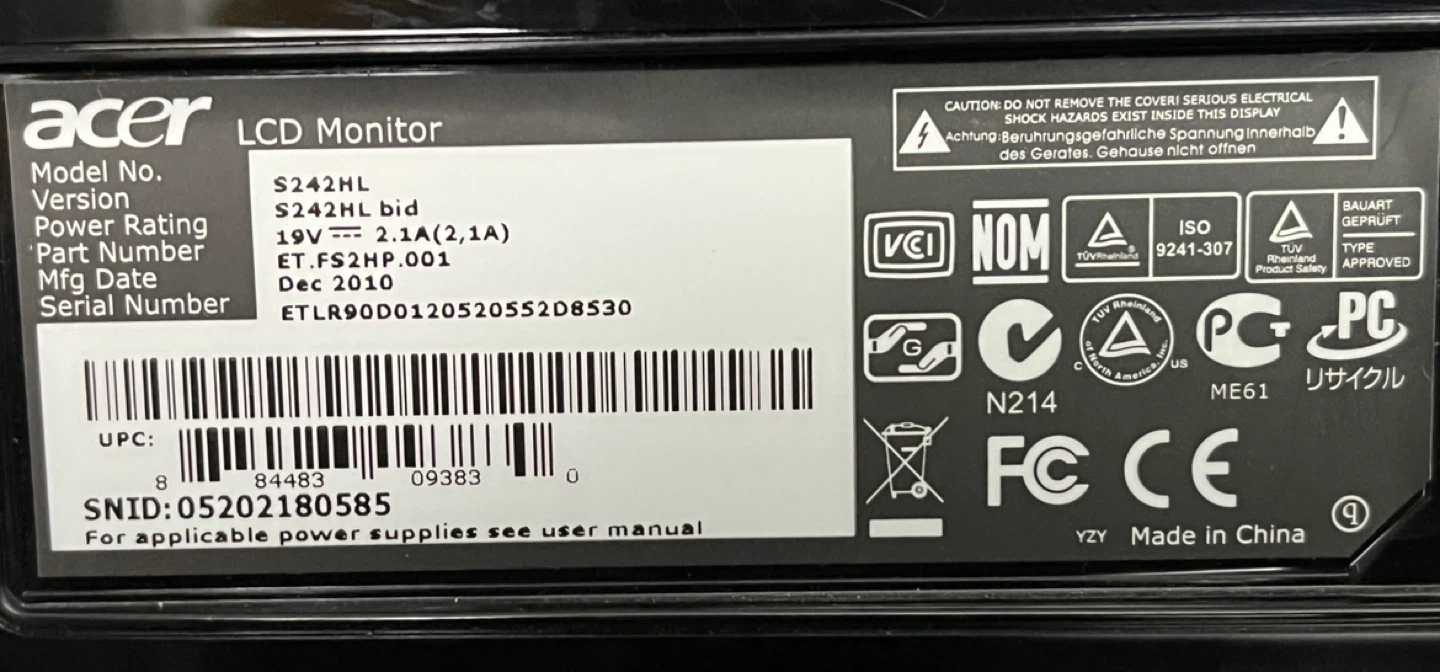 Acer S242HL LCD monitor in very good condition with cables.