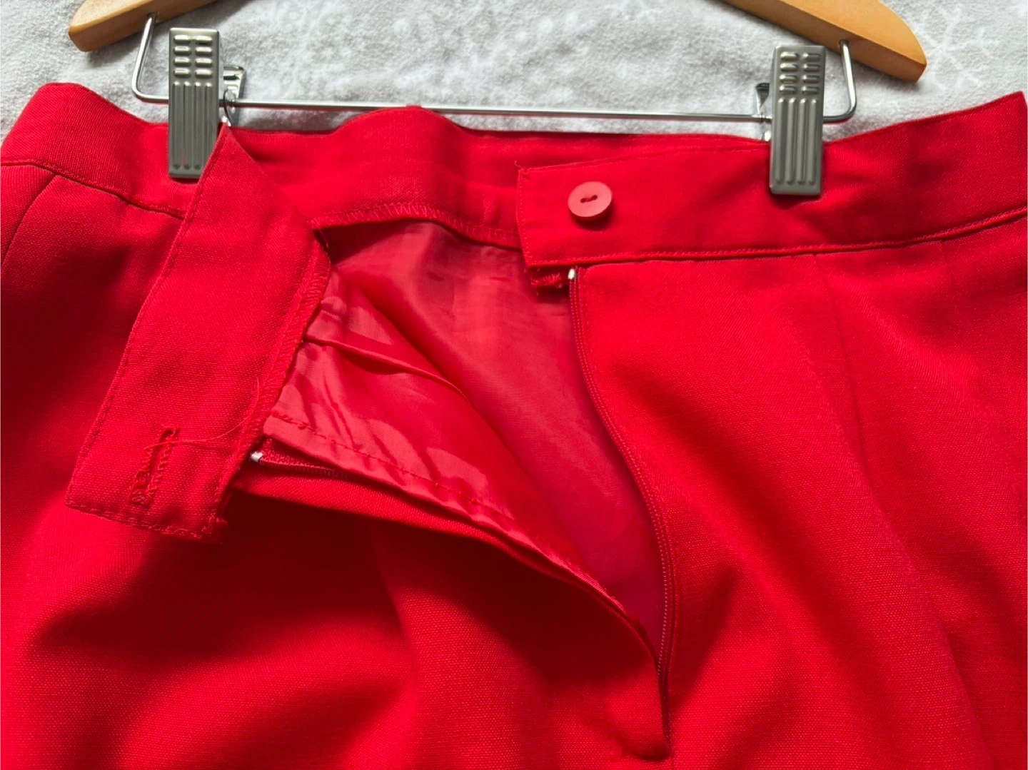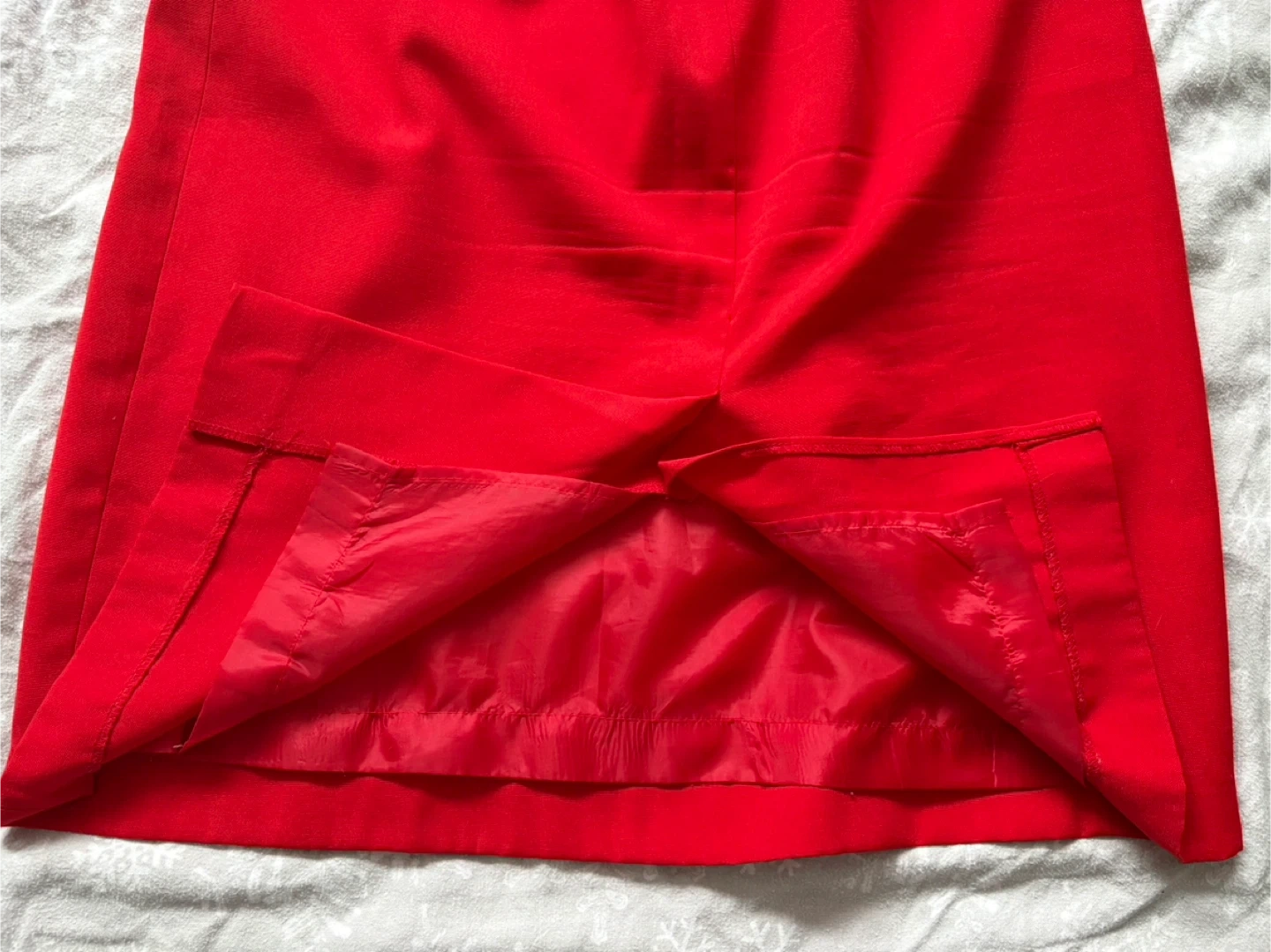 A vibrant red knee-length skirt with a button and zipper closure. It features a silky smooth lining for comfort. This classic A-line style skirt has a subtle slit at the front for ease of movement.