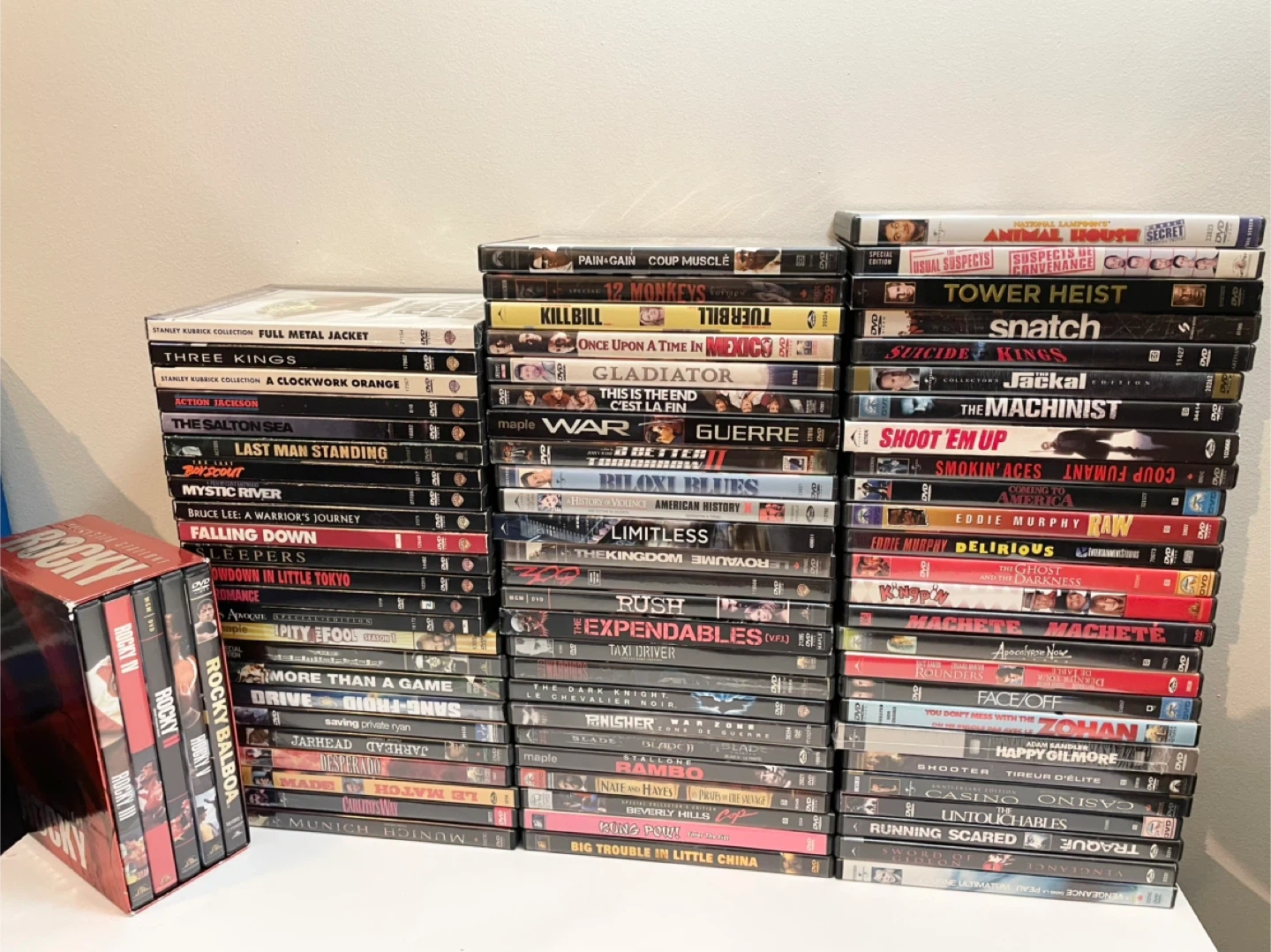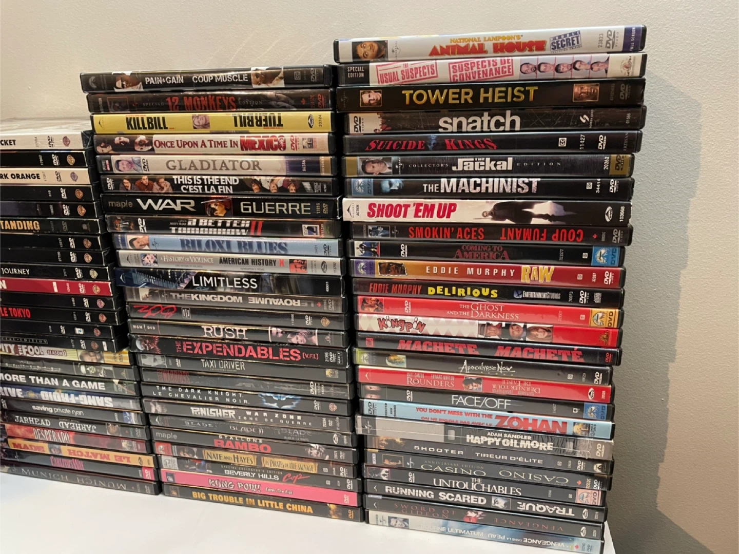 Collection of DVDs including complete seasons of The Sopranos and The Wire, plus many popular movies. Includes various TV series seasons and standalone films. A great set for any movie or TV enthusiast! 2.50 and up .