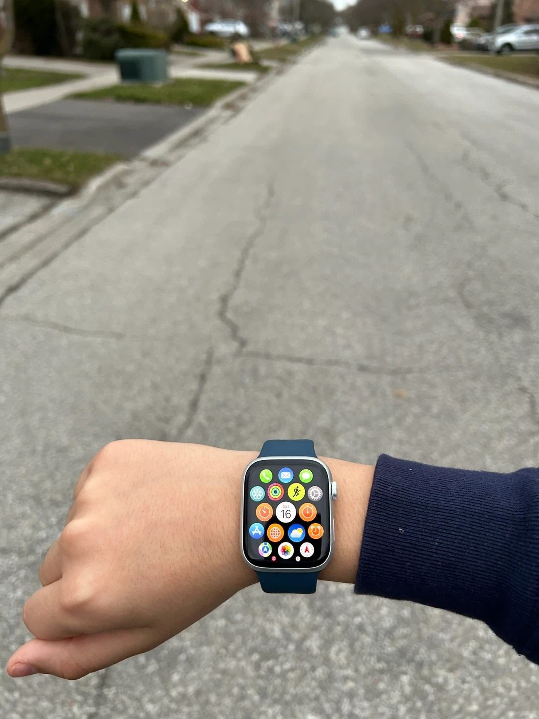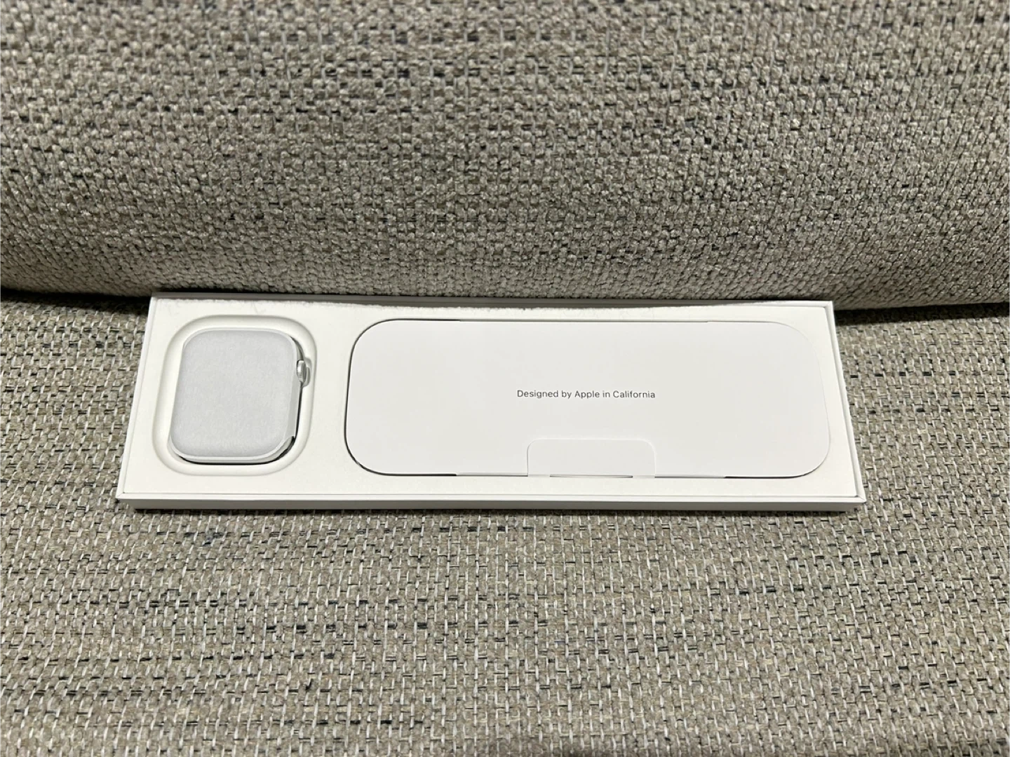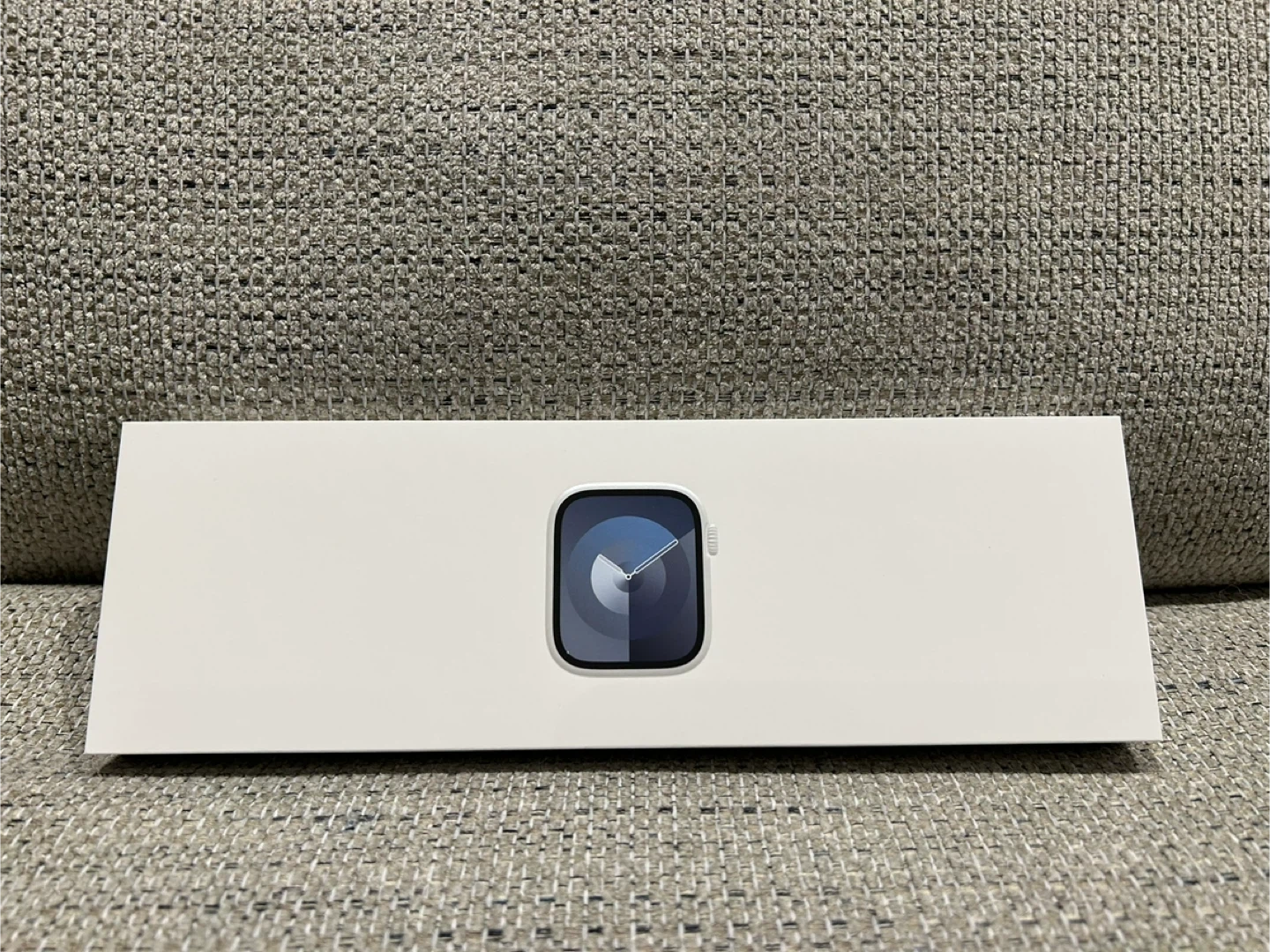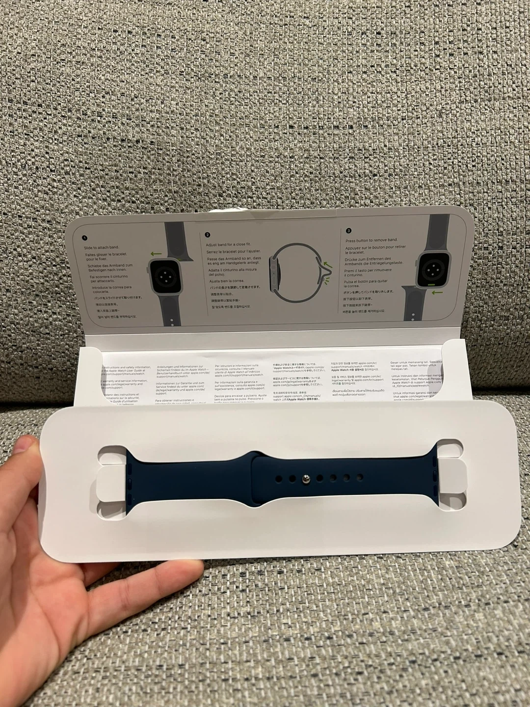 Apple Watch Series 9 in Storm Blue. This is a sport band. It comes with the original box. Designed by Apple in California.