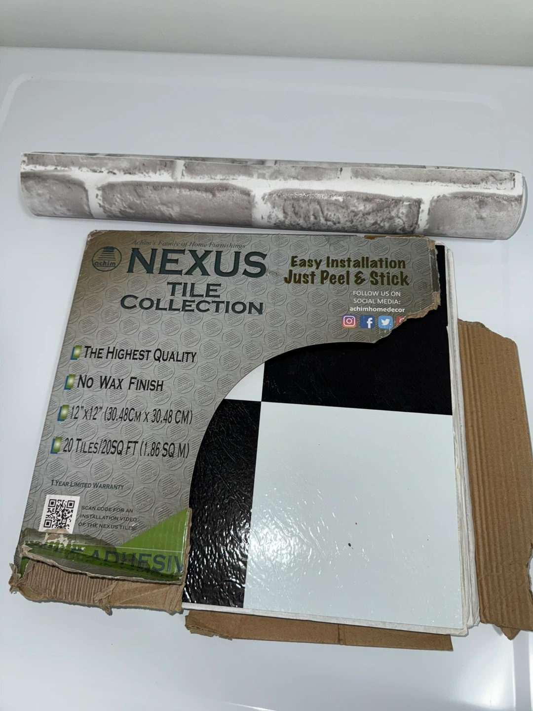 261Selling ACHIM Nexus Tile Collection and brick-patterned wallpaper. The tiles are 12"x12" (30.48cm x 30.48cm) and there are 19 tiles in the box, cog Easy peel and stick installation! Also included is a roll of brick-patterned wallpaper, approximately 17.7 x 472.4 inches.