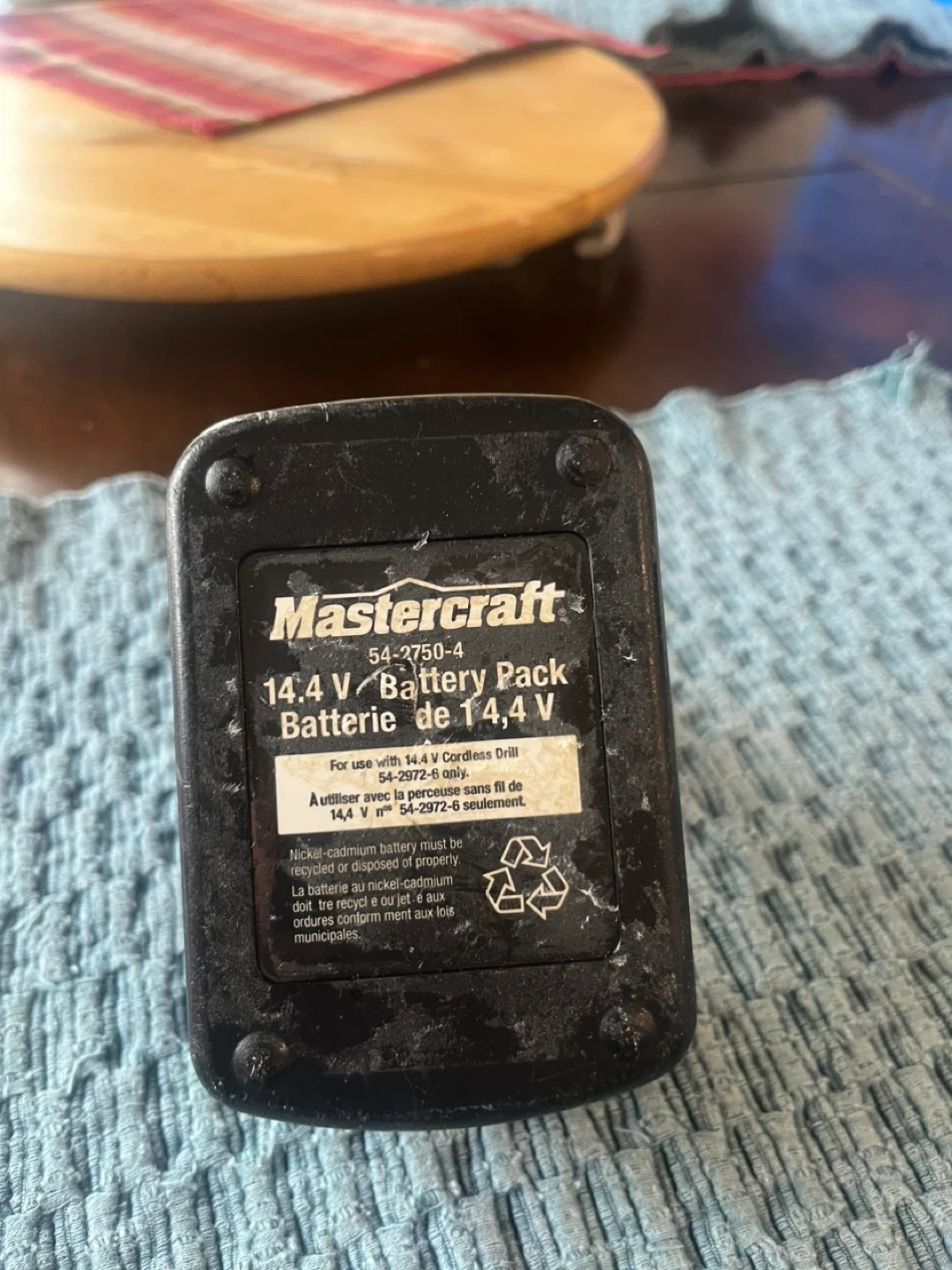 This is a Mastercraft 14.4 V battery pack for a cordless drill. It's a Nickel-Cadmium battery. Usable with model 54-2972-6.