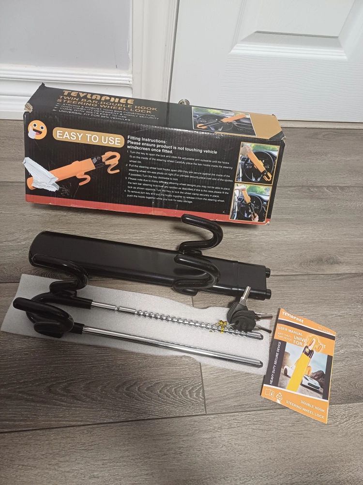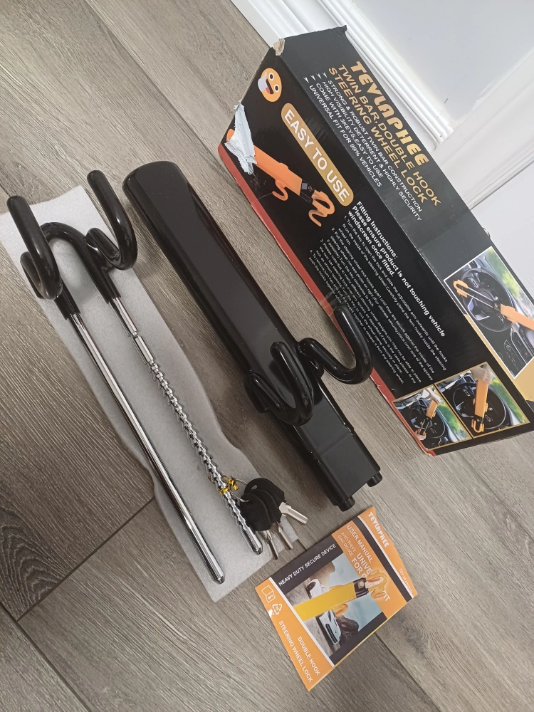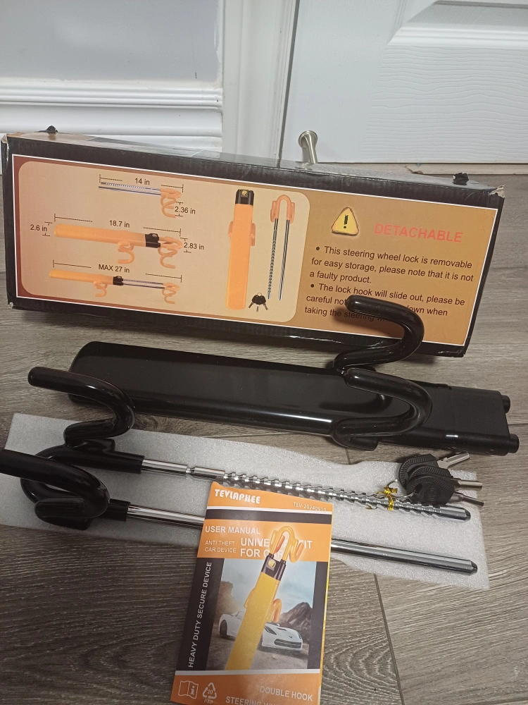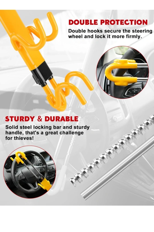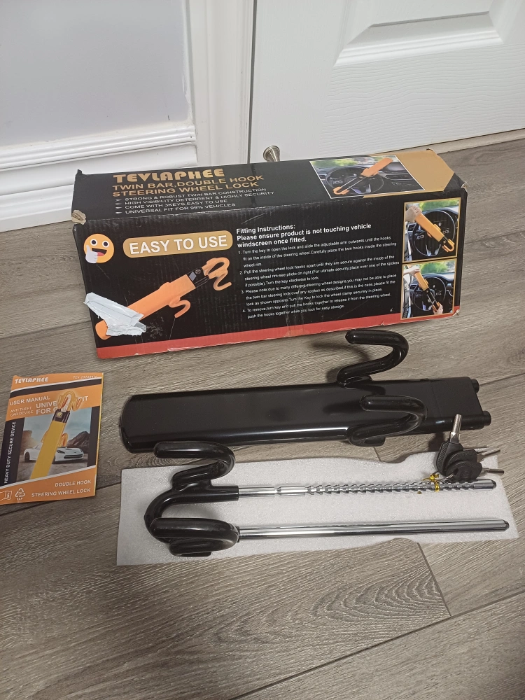 Keep your car safe with this TeylaPhee steering wheel lock! It's a heavy-duty secure device that's easy to use. The double hook design provides extra protection. It's made with a solid steel locking bar and sturdy handle, making it a powerful deterrent for thieves. The box and user manual are included!