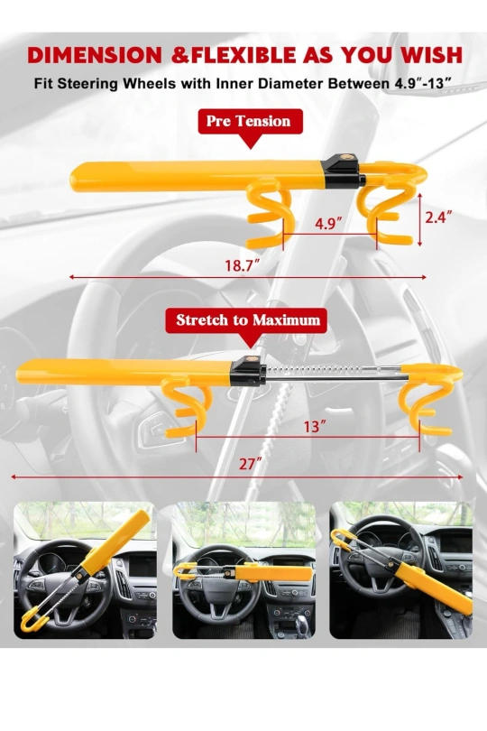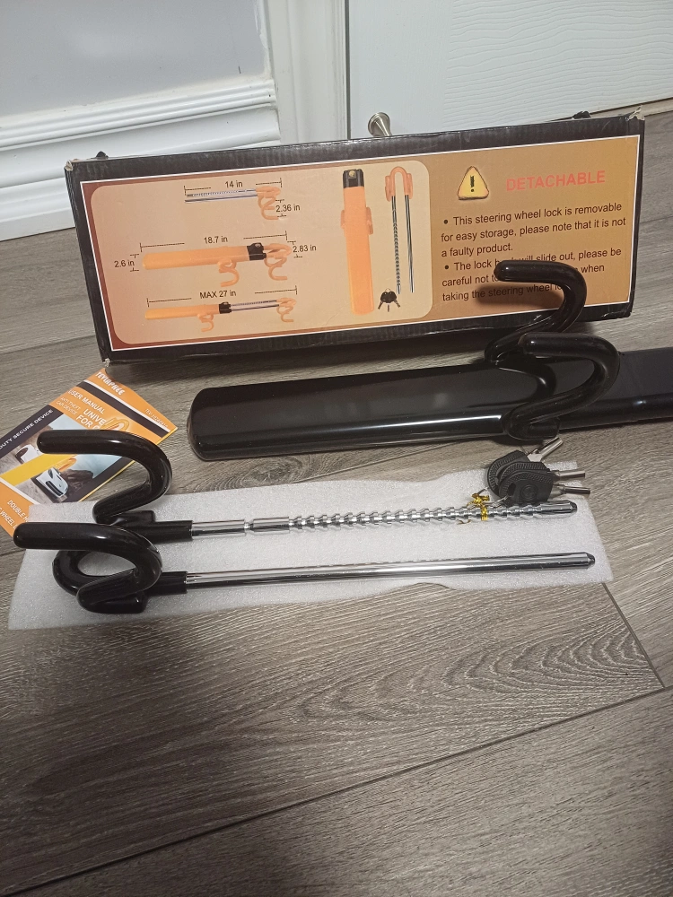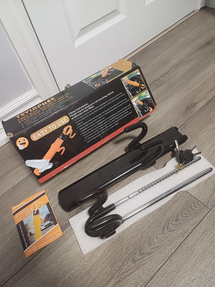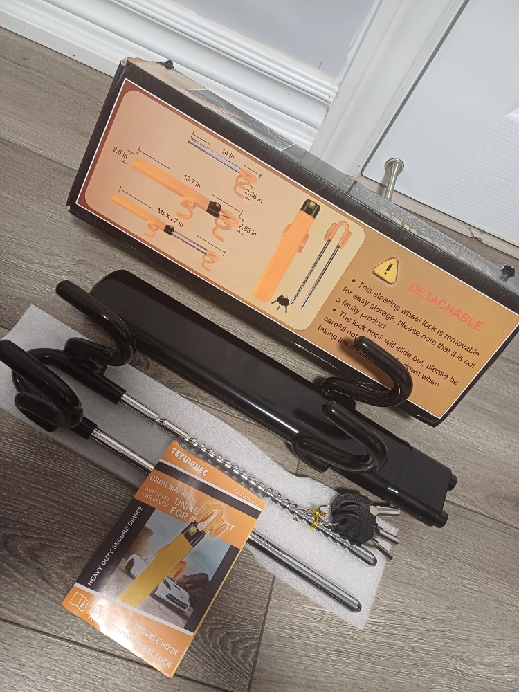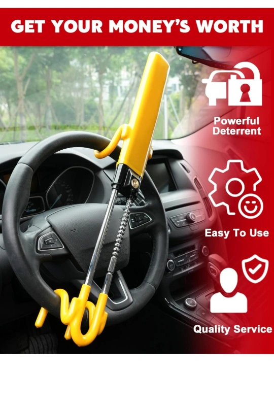 Keep your car safe with this TeylaPhee steering wheel lock! It's a heavy-duty secure device that's easy to use. The double hook design provides extra protection. It's made with a solid steel locking bar and sturdy handle, making it a powerful deterrent for thieves. The box and user manual are included!