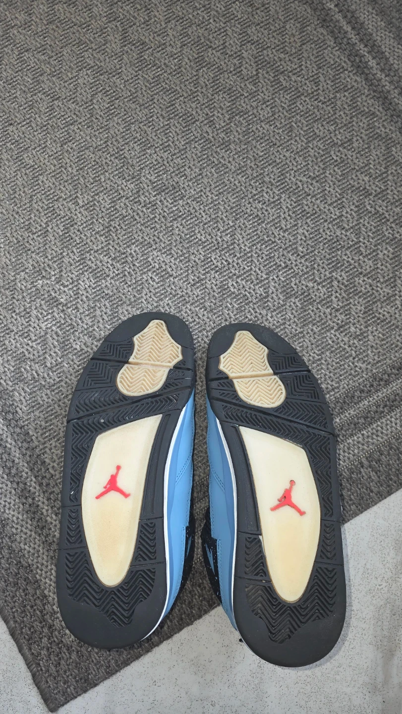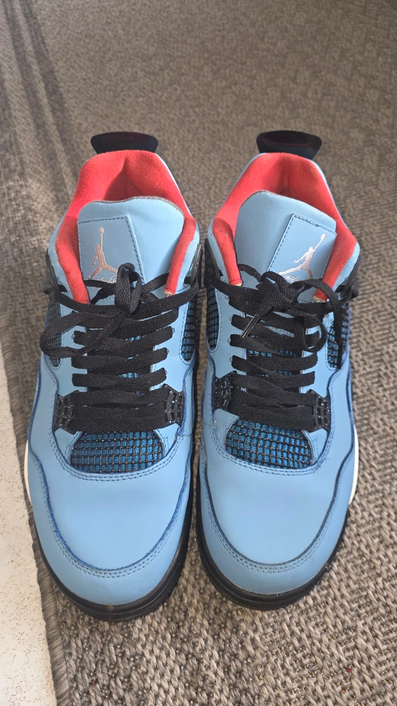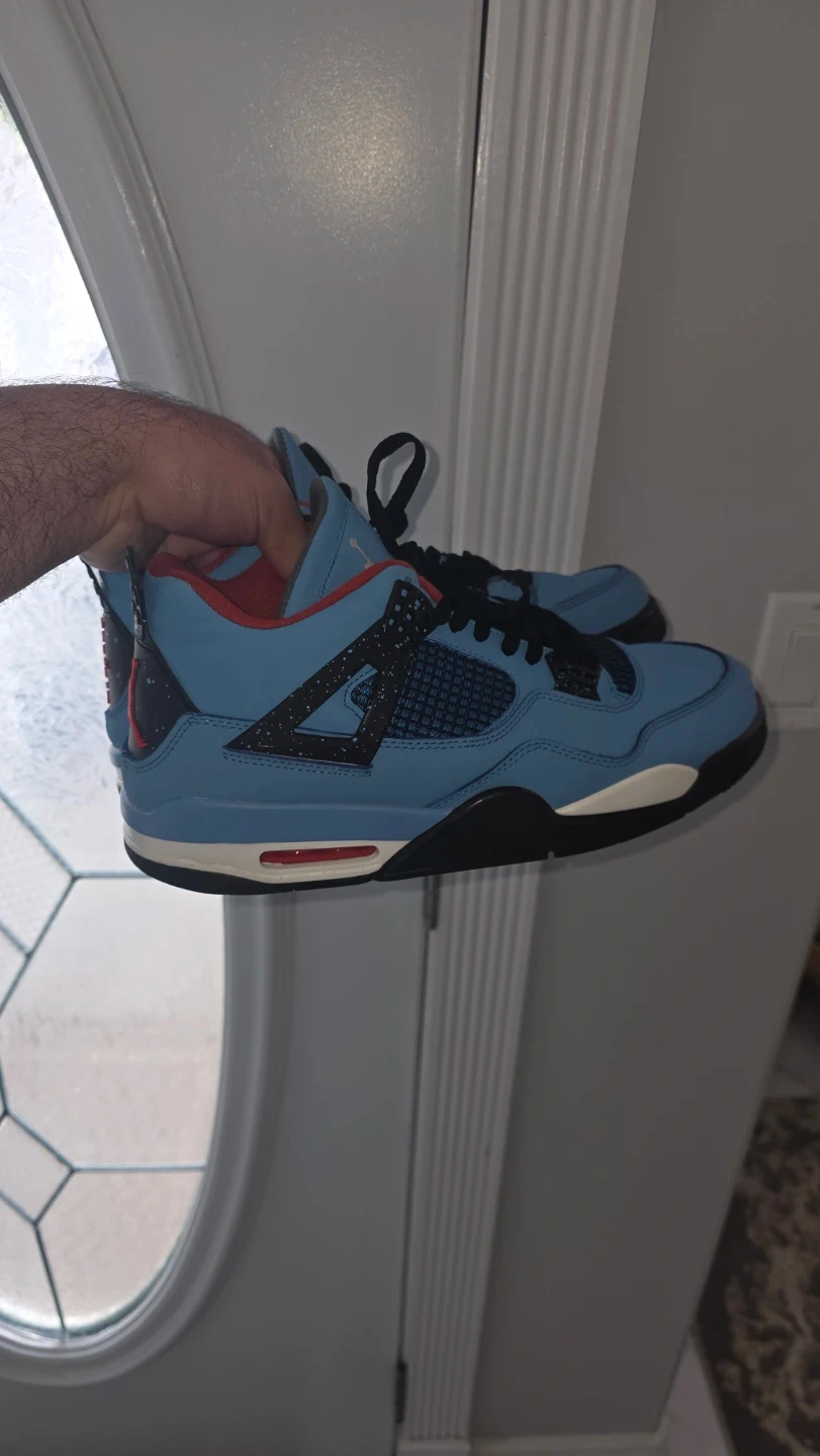 These are the Air Jordan 4 Retro Travis Scott Cactus Jack sneakers. They feature a light blue nubuck upper with red accents. The signature "Cactus Jack" detailing is present on the heel.