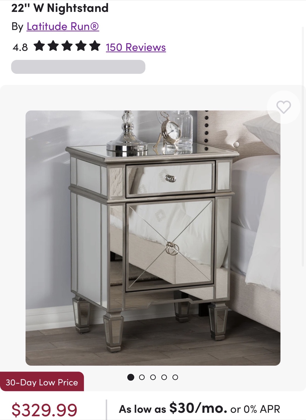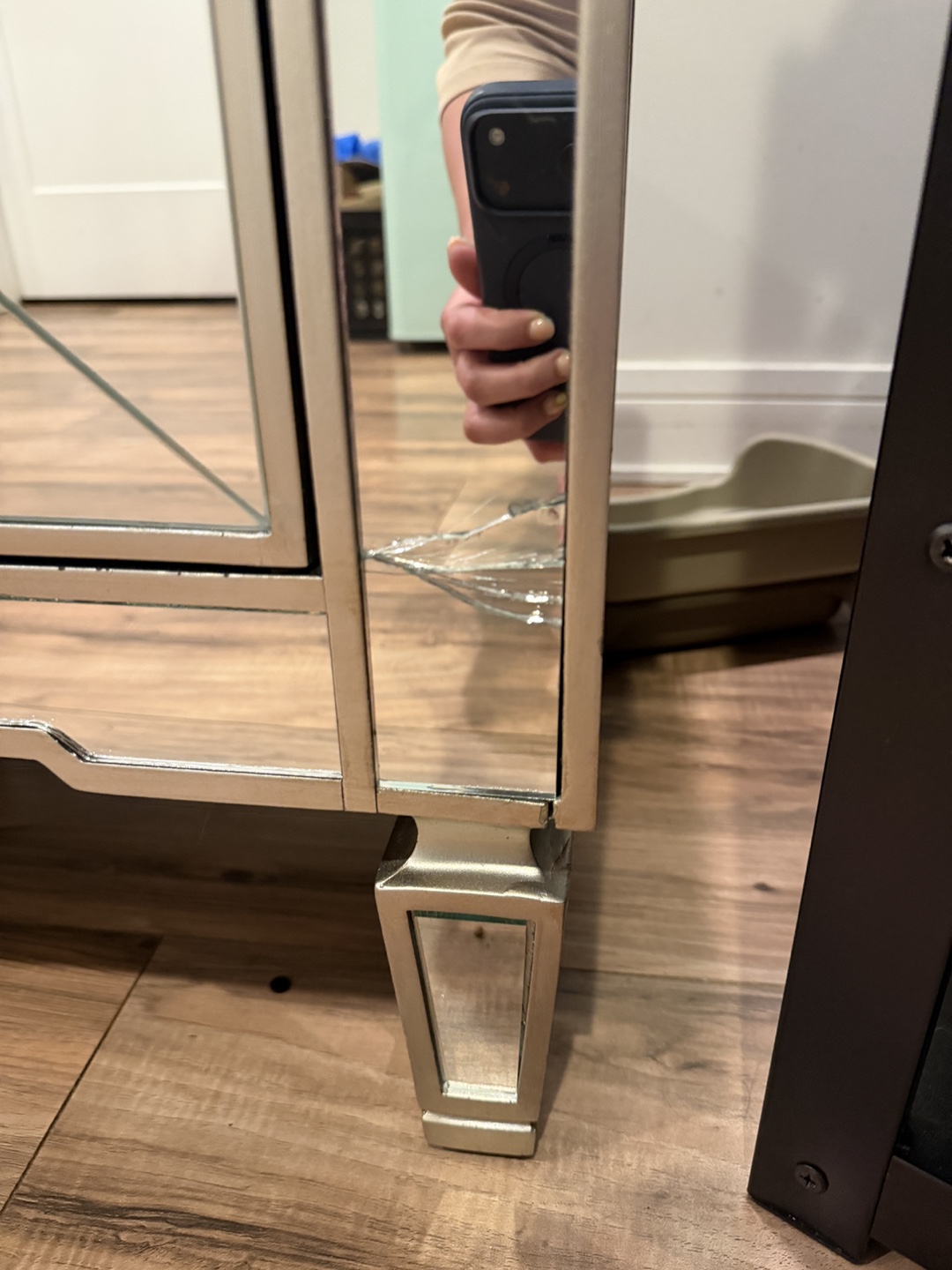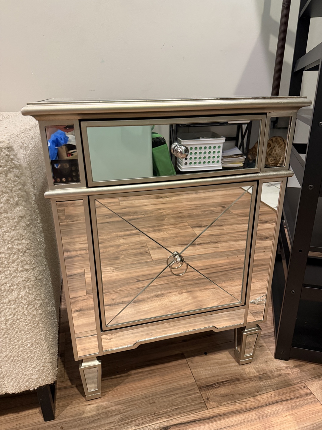 This mirrored nightstand has one drawer and one cabinet space below. Please note there is a crack in the mirrored panel on the right side.