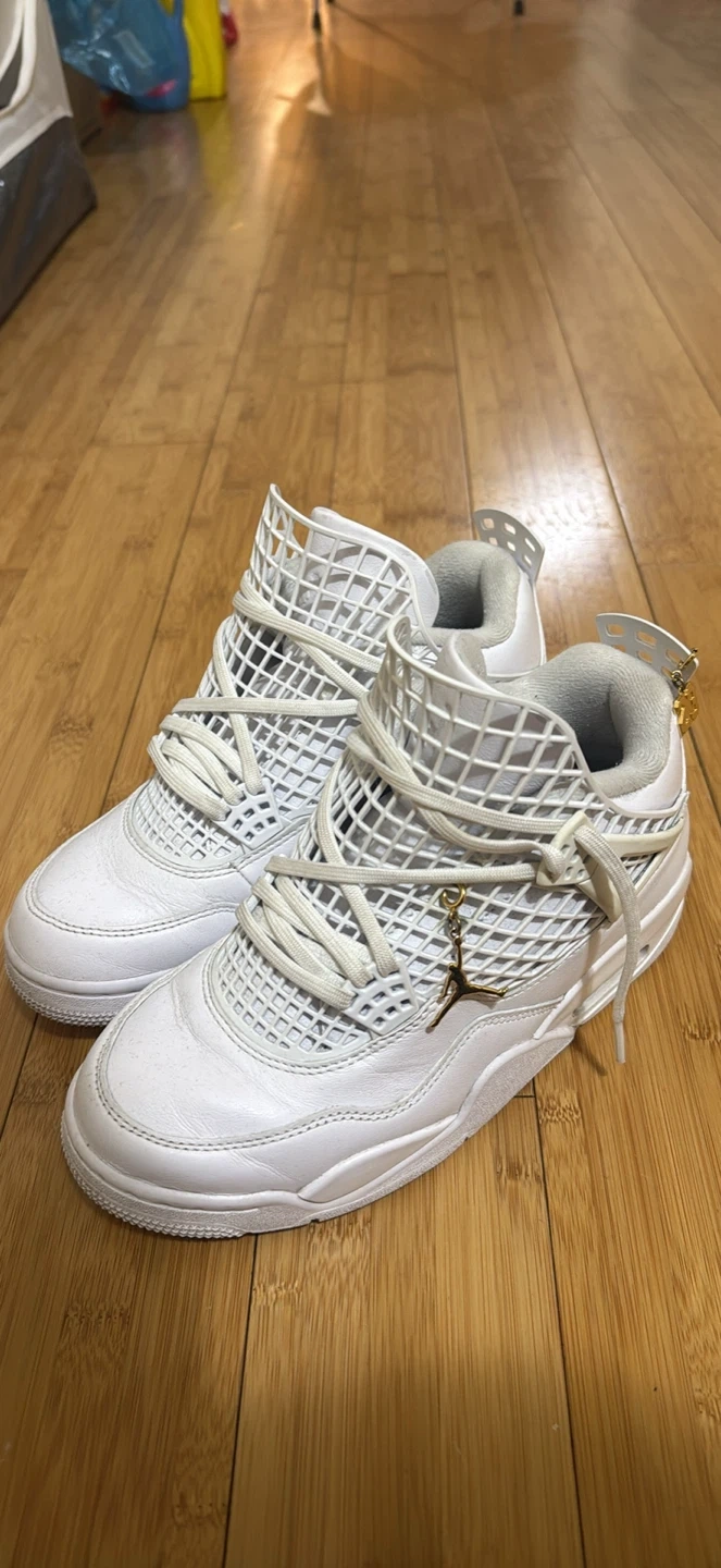 White leather and mesh sneakers with a unique cage-like overlay. Features Jumpman branding and a gold lace tag. These kicks are stylish and have a distinctive look. Perfect for sneaker enthusiasts!