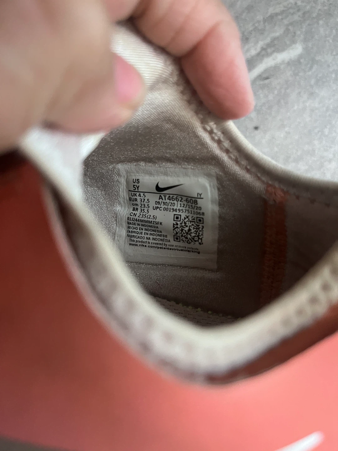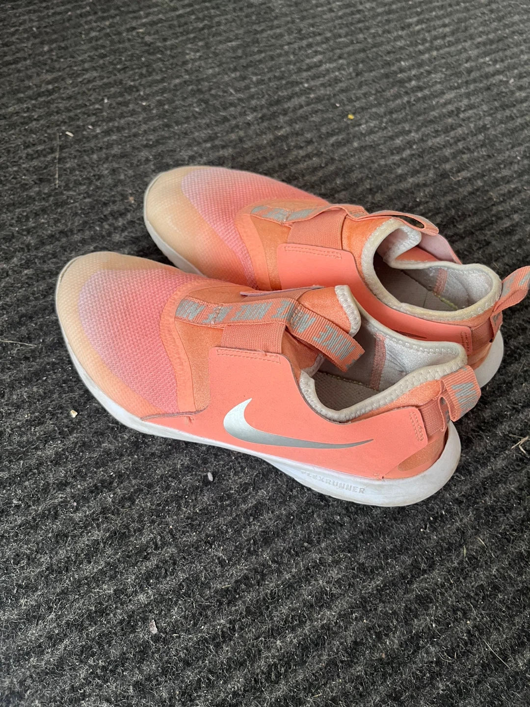 Nike running shoes in a vibrant coral colour. They're a women's size 7 US. These slip-on shoes feature a breathable mesh upper and a flexible sole for a natural feel. They're great for your daily runs or casual wear!