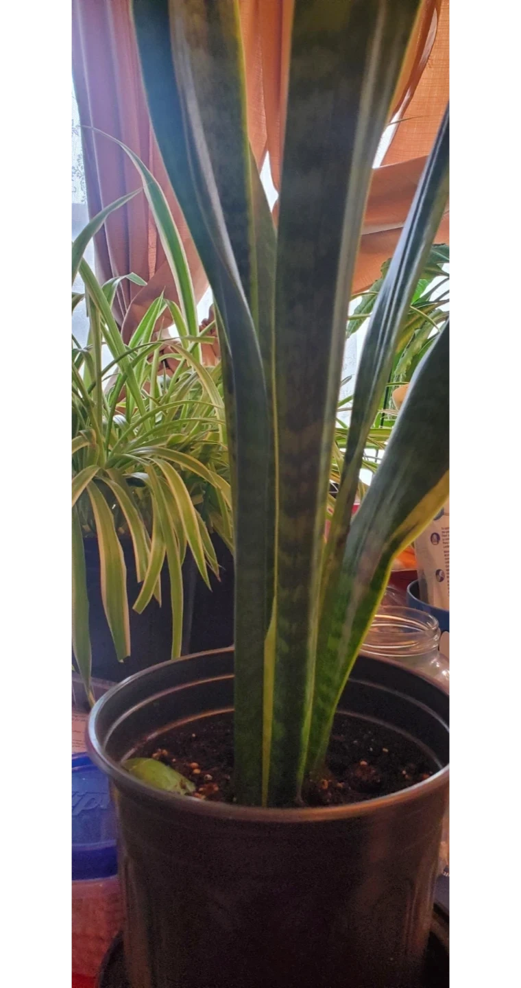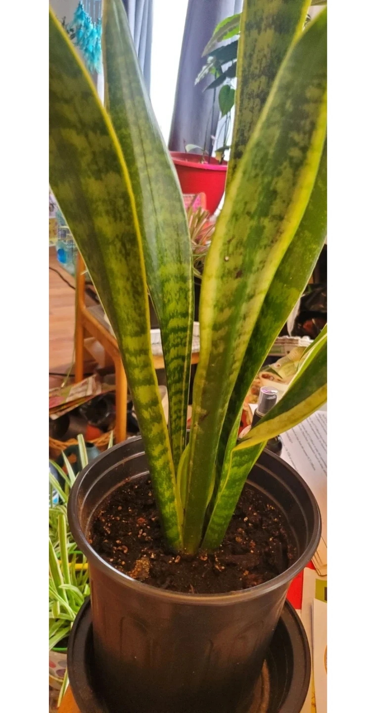 A healthy Snake Plant in a dark brown pot. It's known for its air-purifying qualities. This plant thrives in various light conditions.