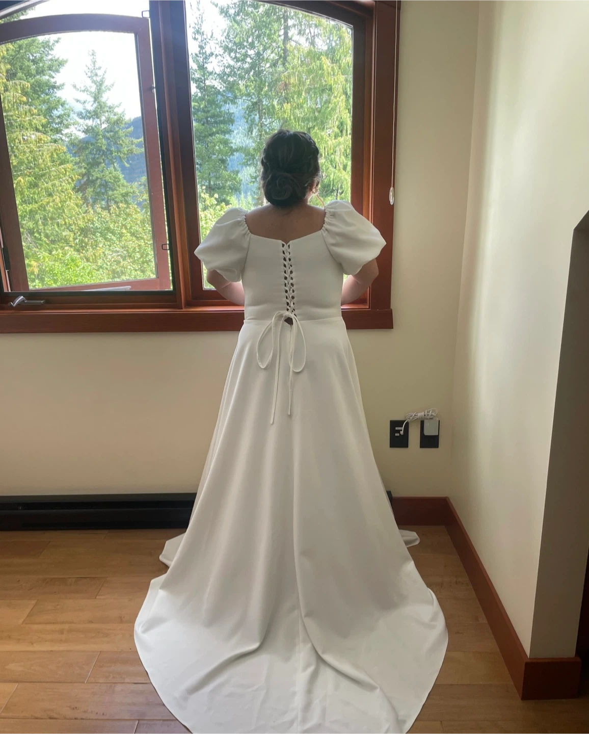 A beautiful white wedding dress featuring a corset-style lace-up back and dramatic puff sleeves. The gown has a full skirt with a slight train. It's perfect for a wedding day! Material is satin.