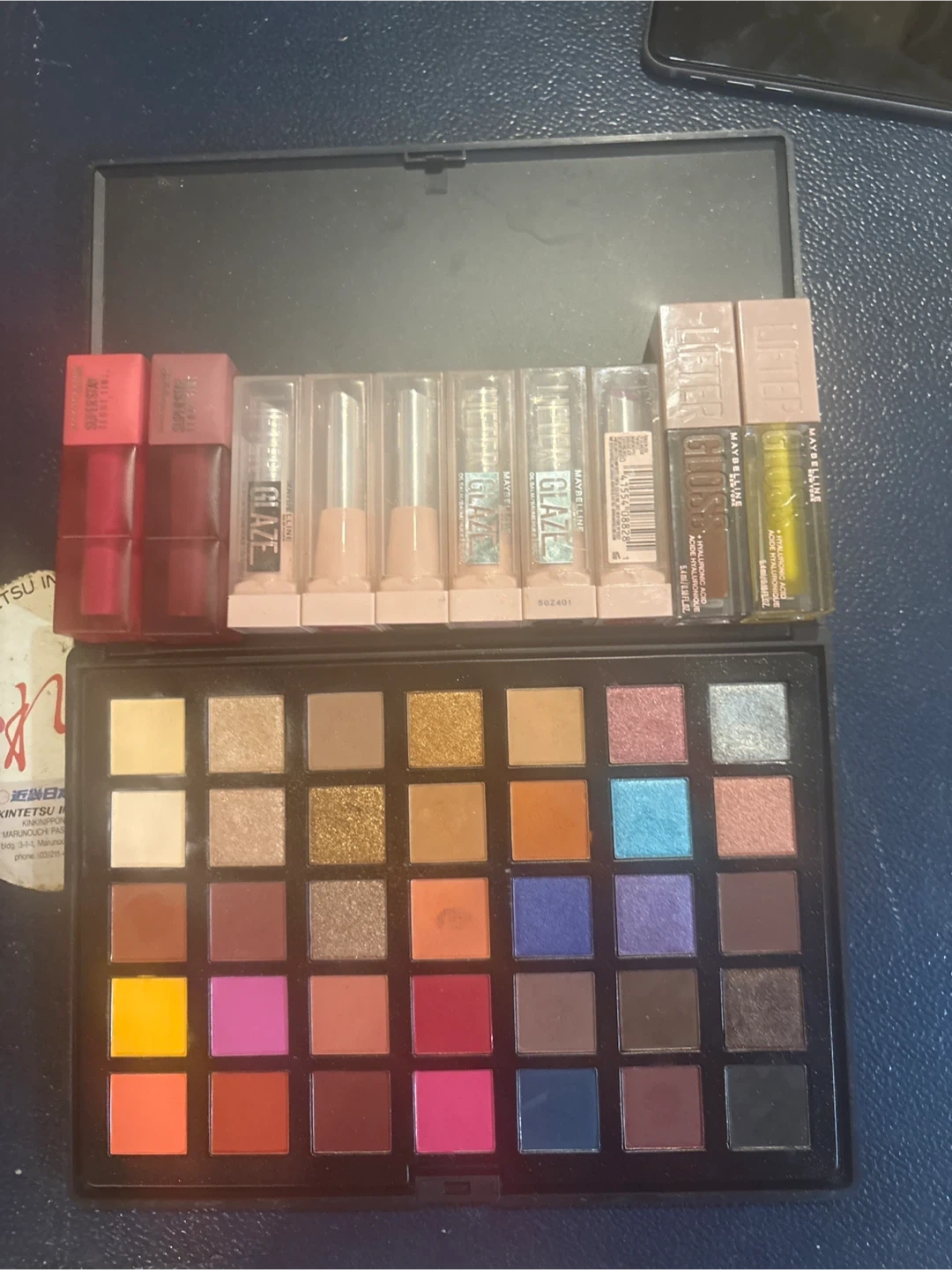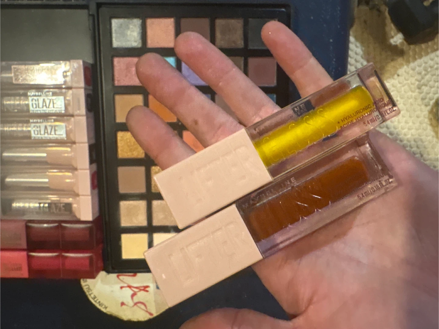 Two Maybelline SuperStay Matte Ink lipsticks in shades of red and pink. Also includes several Maybelline Lifter Glosses with hyaluronic acid, in various shades and finishes. The lipsticks are 5.4ml/0.18 fl oz each.