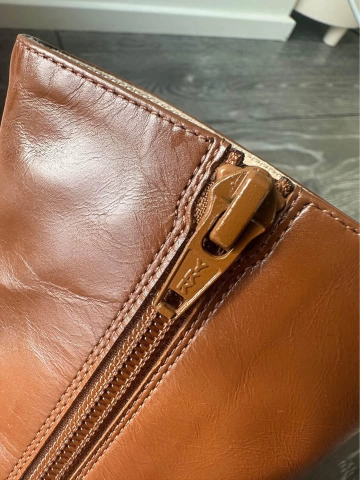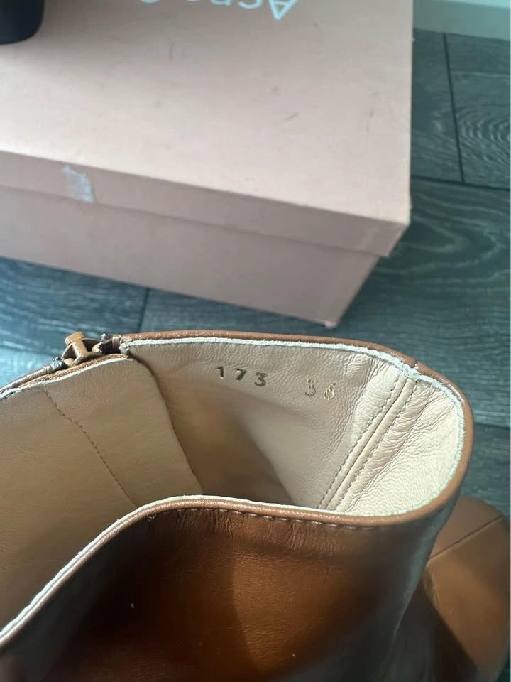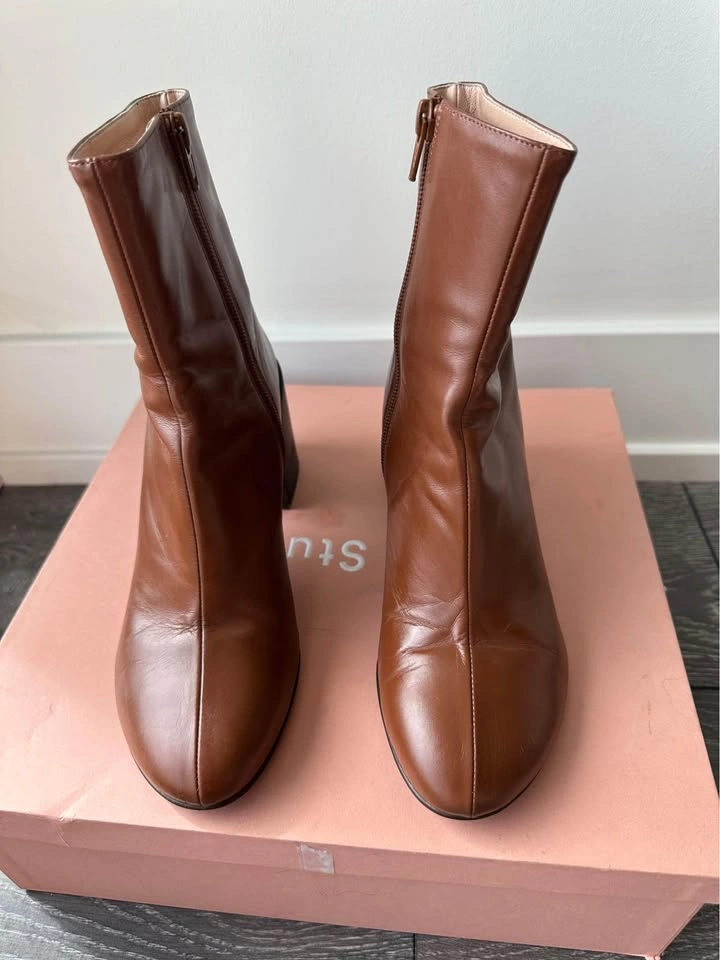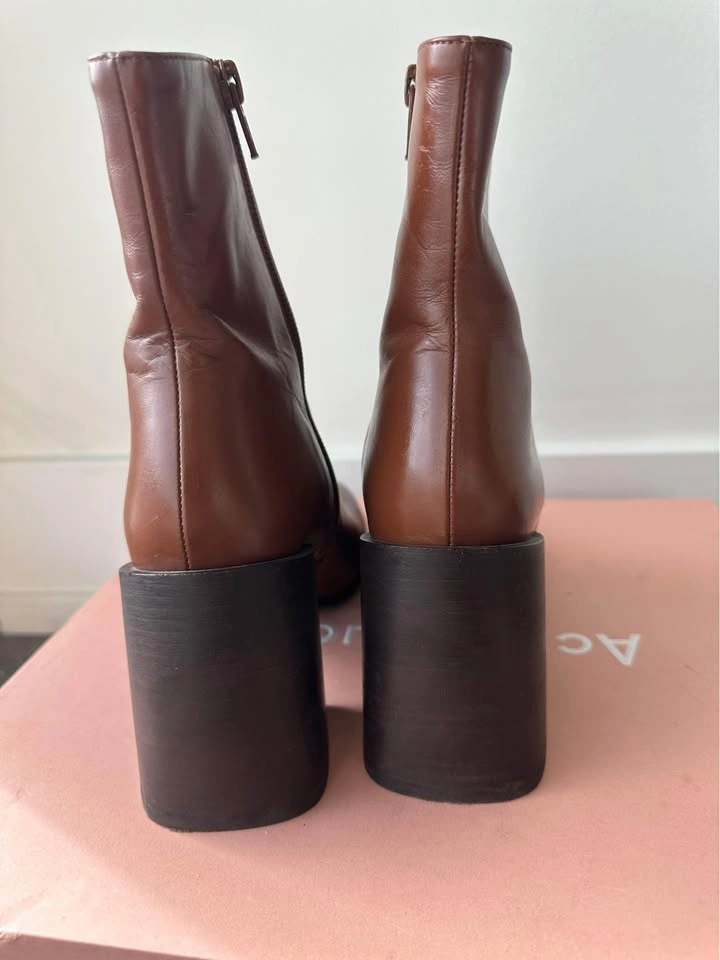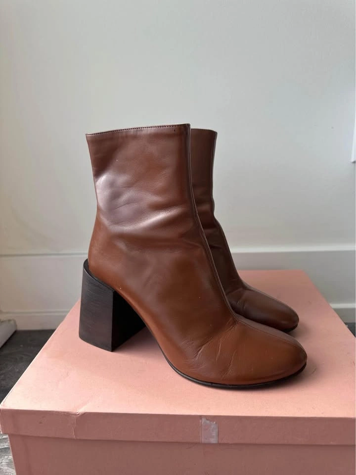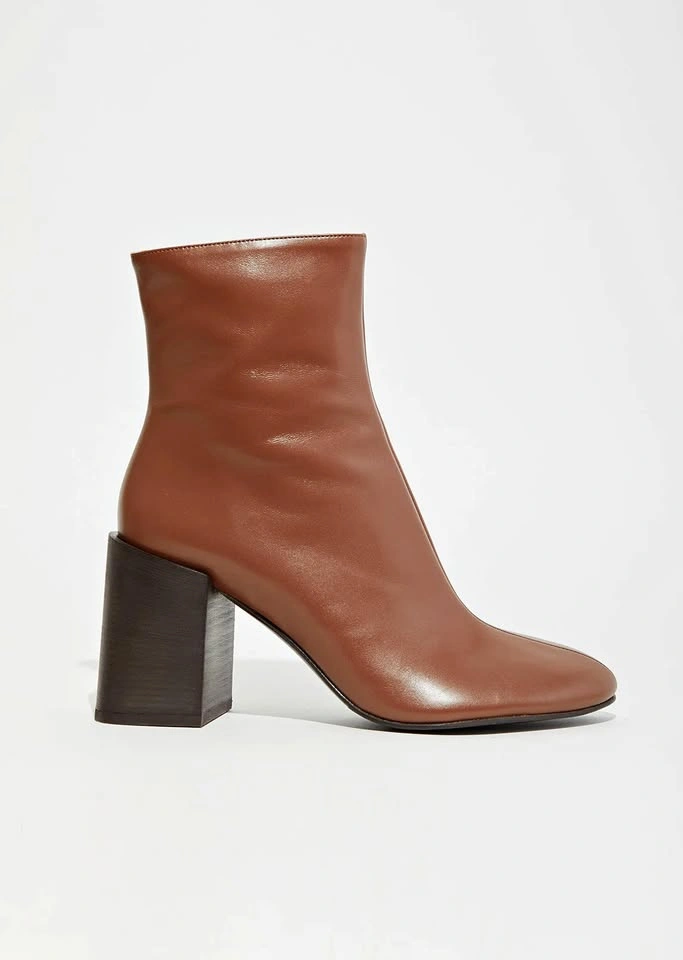 Women’s Size EU 36 / US 6. Cognac-hued ankle boots in smooth calf skin, with a subtle center seam and inner zips. Contrasting stacked heel. Tonal inner zips. Contrasting nude calf leather lining. Color: Cognac Brown. Upper: 100% Calf Leather. Made in Italy.