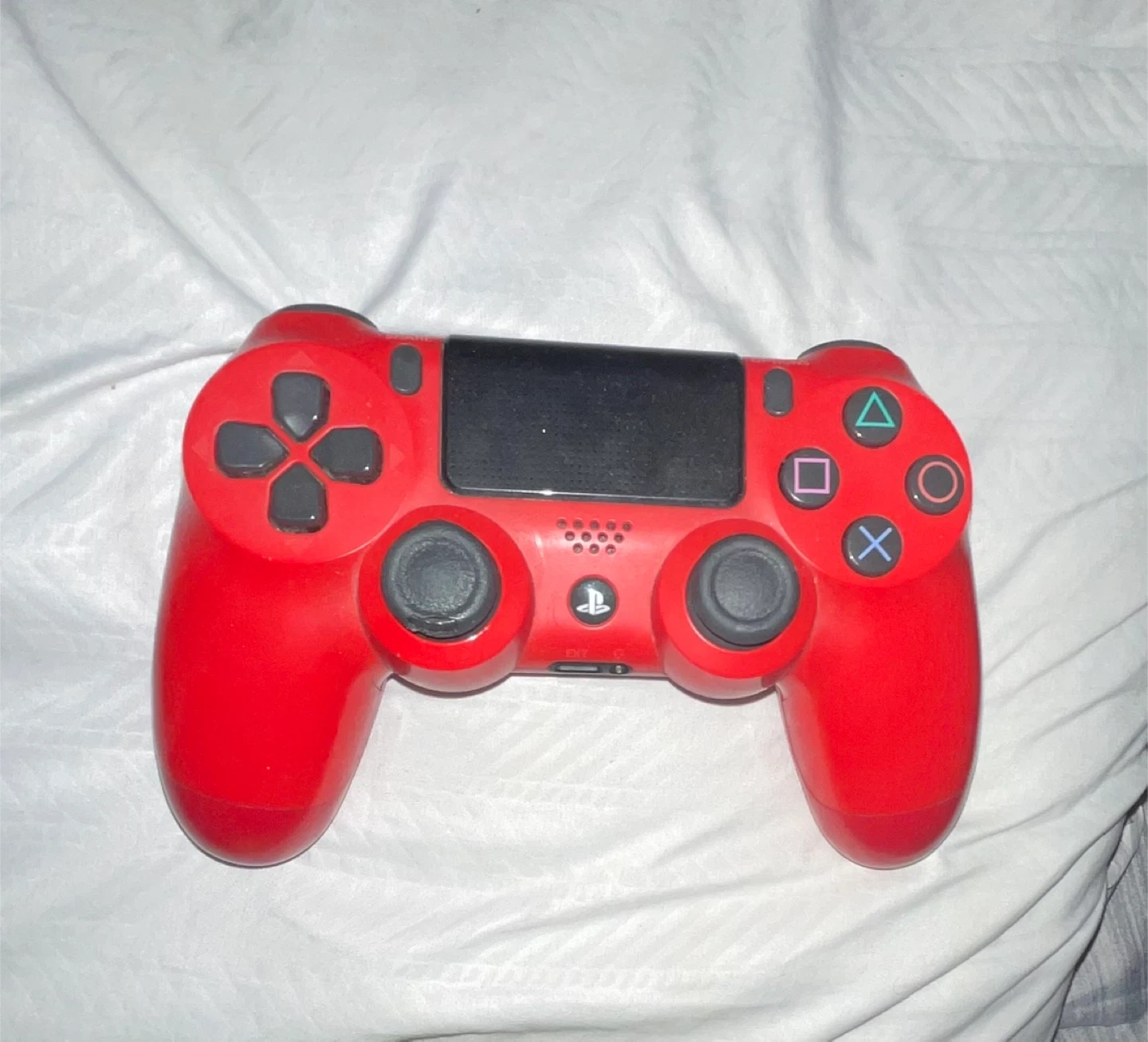 This is a red DualShock 4 controller for PlayStation. It features standard button layout and analogue sticks. Perfect for gaming sessions!