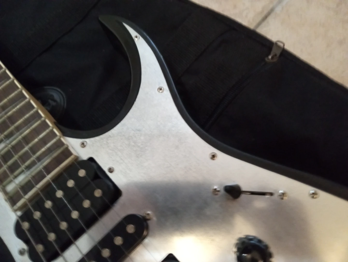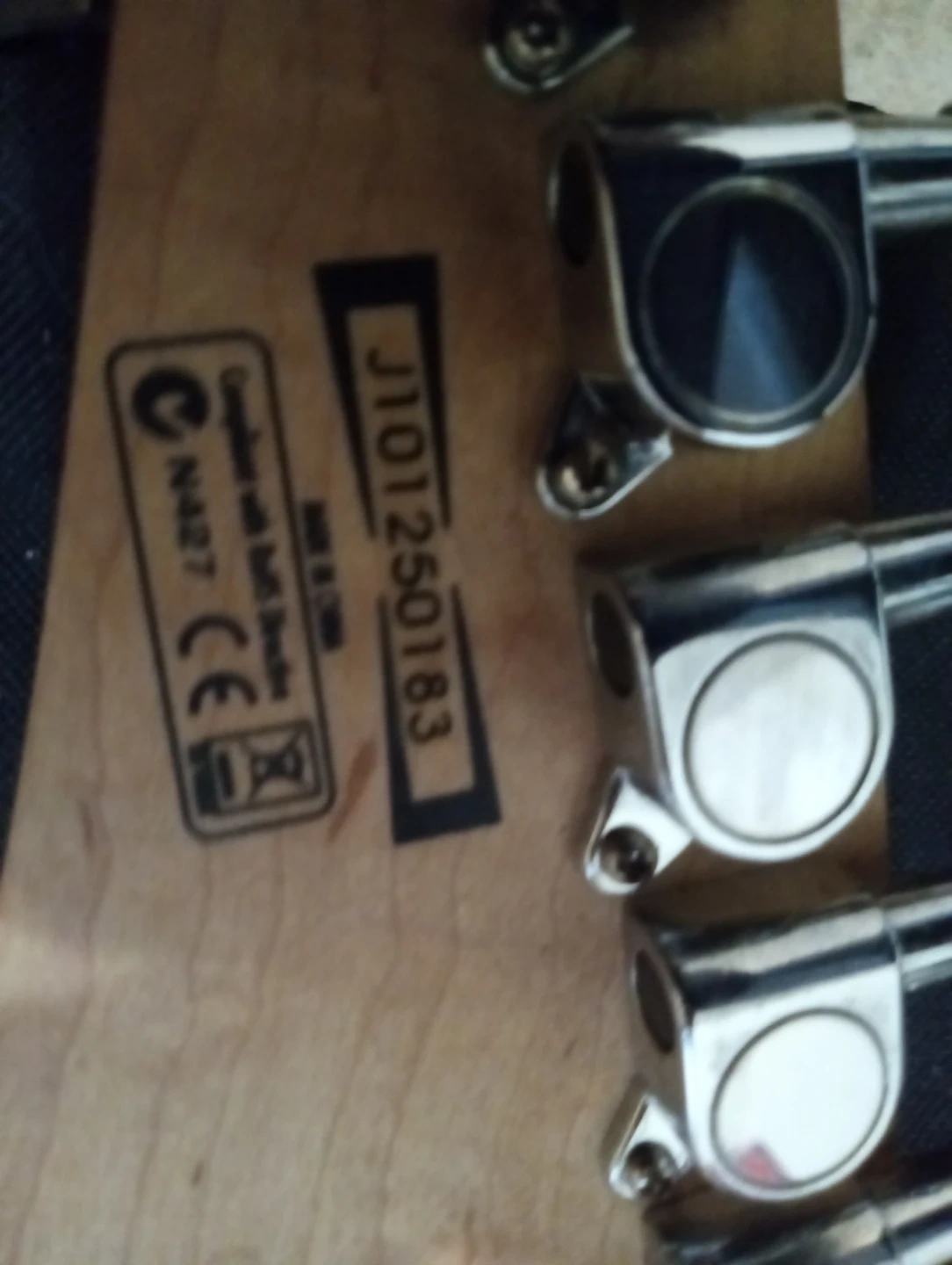 Black electric guitar with a silver pickguard and bridge. It comes with a gig bag, a strap, and a "Rock 'n' Roll" instructional book. Serial number is J101250183. Message through carrot 1908 Gerrard e 204
