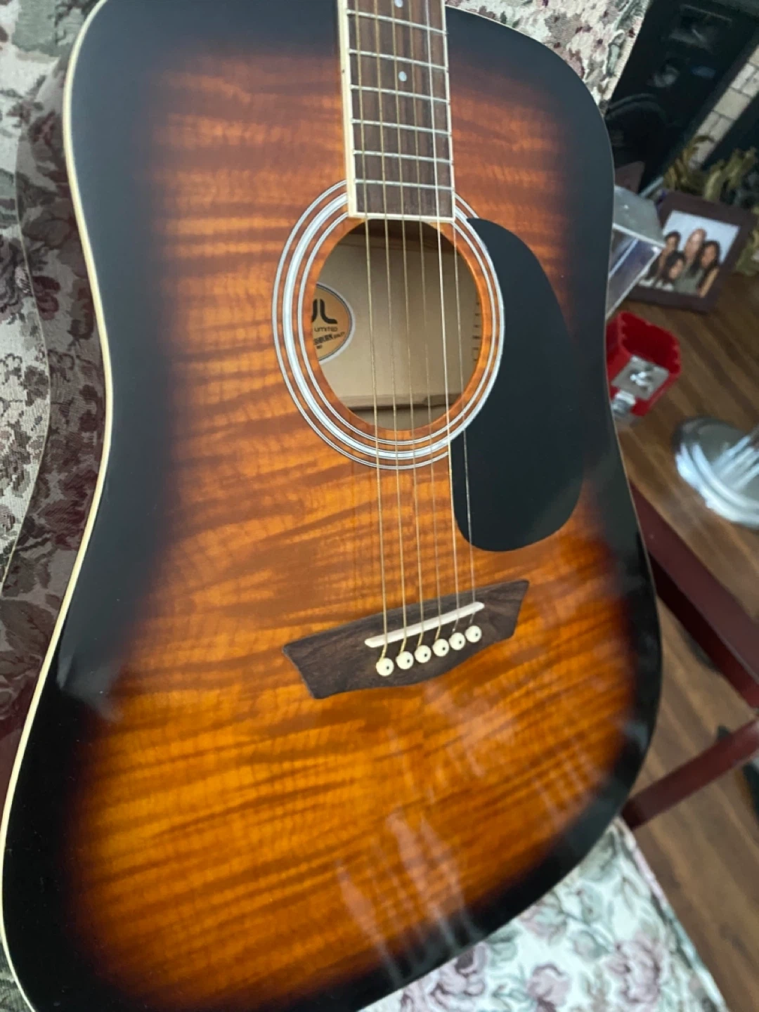 21Selling a used GWL acoustic guitar! It's in good condition and has a beautiful tiger stripe finish. Perfect for beginners or experienced players looking for a reliable instrument. This is a very beautiful well playing $400 plus guitar. Needs new strings.