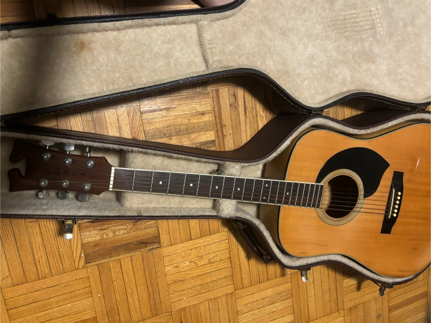 55Selling an acoustic guitar that comes with a hard case for protection and easy transport. It's in good condition and ready for a new owner to enjoy playing!
