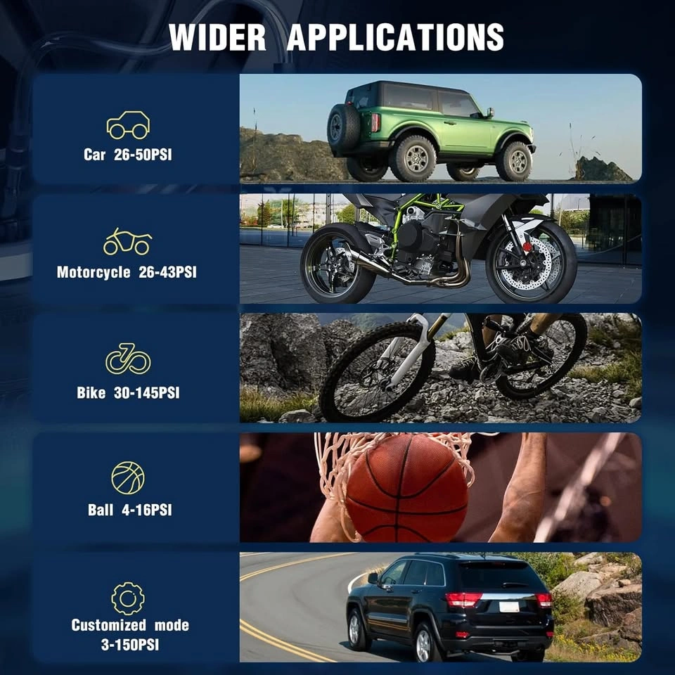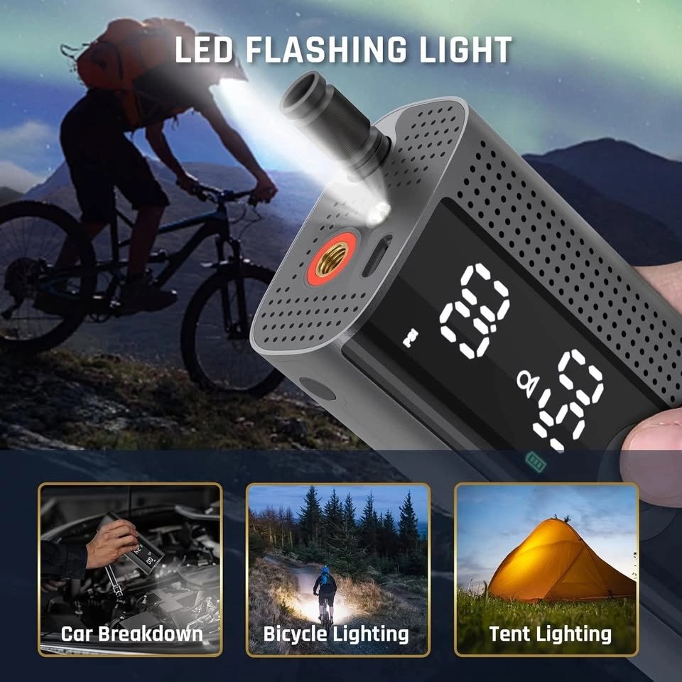 101Key Features: High Power & Fast Inflation – 150 PSI max pressure & 13 L/min airflow for quick inflation. Fills a standard 185/65 R15 car tire (0-36 PSI) in ~1 minute. Precision & Safety – Accurate LCD dual display (shows real-time & preset pressure). Auto shut-off when reaching the preset PSI to prevent over-inflation. 4 pressure units: PSI, BAR, KPA, KG/CM². Built-in cooling fan for heat resistance and explosion-proof safety. 5 Smart Modes & Deflation Function – Preset and memorize your desired pressure. Deflation mode to adjust tire pressure accurately. Cordless & Portable – Built-in rechargeable battery (Type-C charging). Long standby time + LED emergency light for nighttime use. Compact size (6.1 x 4.1 x 15.5 cm) with a handy carry bag. Wide Compatibility – Works for cars, bikes, motorcycles, basketballs, footballs, etc. Not suitable for large trucks (due to high air volume needs). Ideal For: Road trips, emergencies, home/garage use. Cyclists, motorcyclists, and sports enthusiasts. Package Includes: Acpatur Air Compressor Type-C Charging Cable Storage Bag Accessory Nozzles