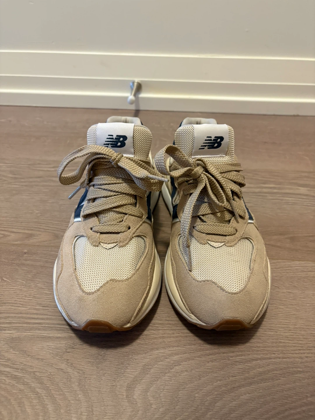 Beige sneakers with navy accents. Comfortable and stylish. Ideal for everyday wear.