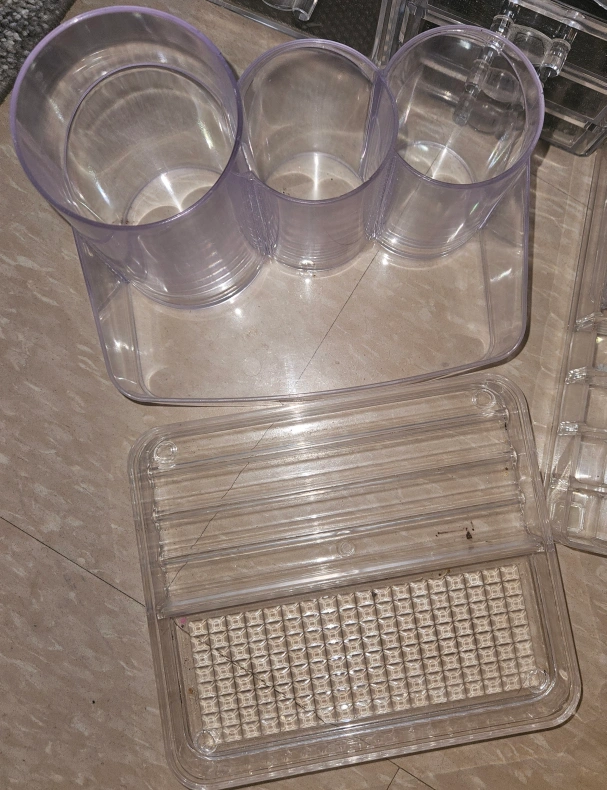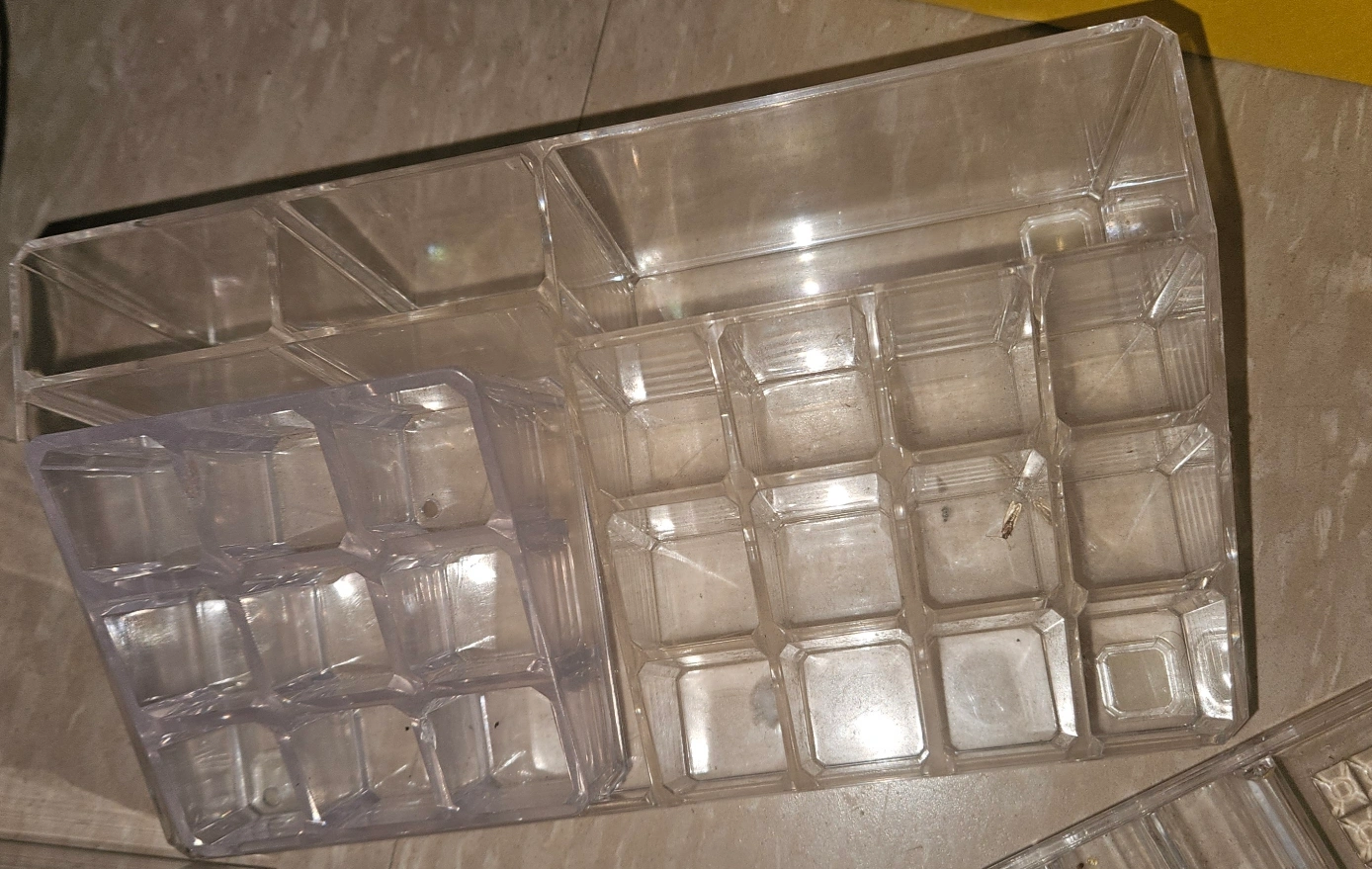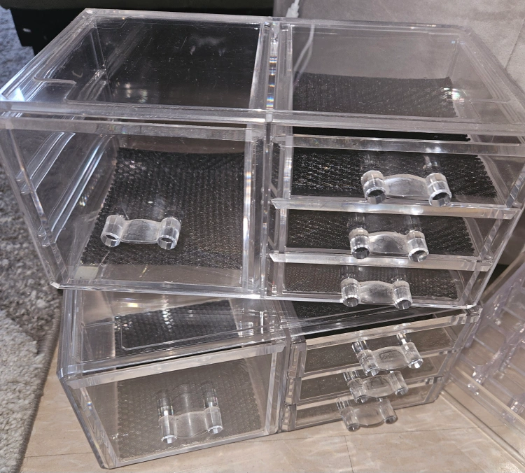 $2 each or $10 for the set of 5 Declutter your vanity with this clear acrylic makeup organizer set! Perfect for storing your cosmetics, brushes, and skincare products. Keep everything neat and tidy with these stackable drawers and compartments
