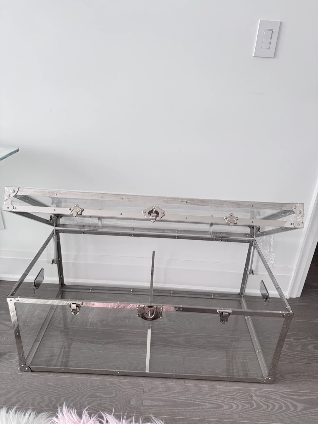 59Selling a stylish acrylic trunk coffee table! It's in great condition and would be a lovely addition to any living space. It's a unique piece that combines functionality with a modern aesthetic! Dimensions: 100cm x 50cm x 45cm