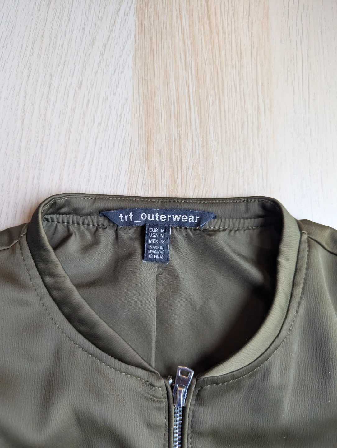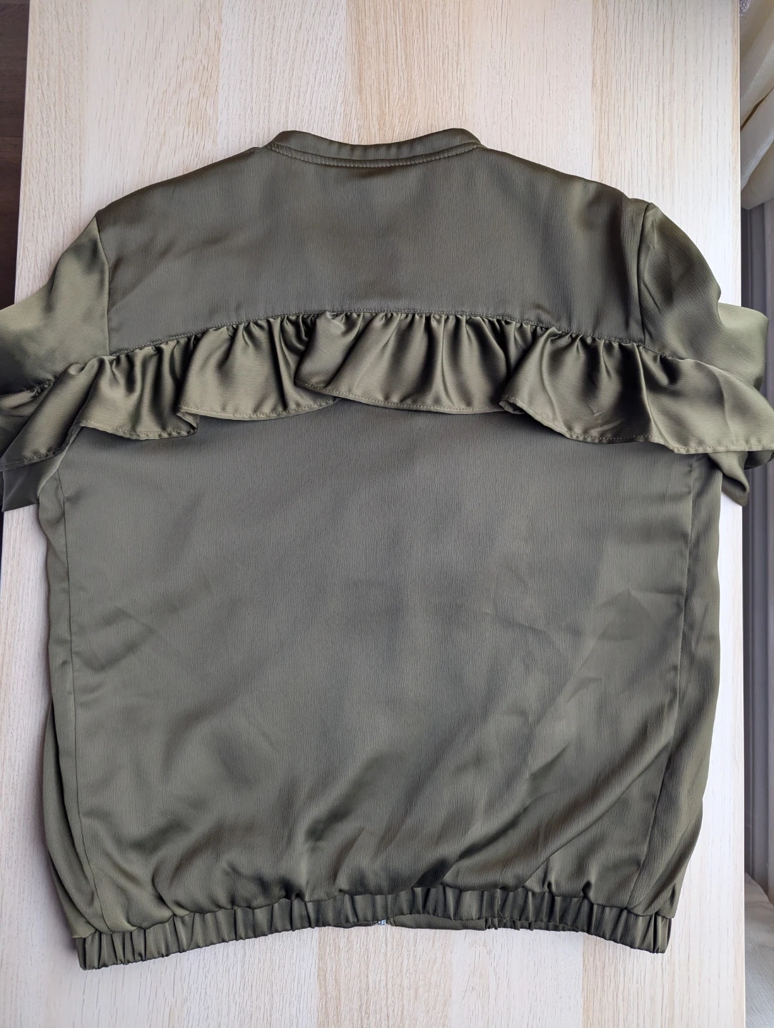 Olive green TRF Outerwear bomber jacket. It's a size medium with ruffled details on the sleeves and back, and a Satin matwrial.Front zipper closure.