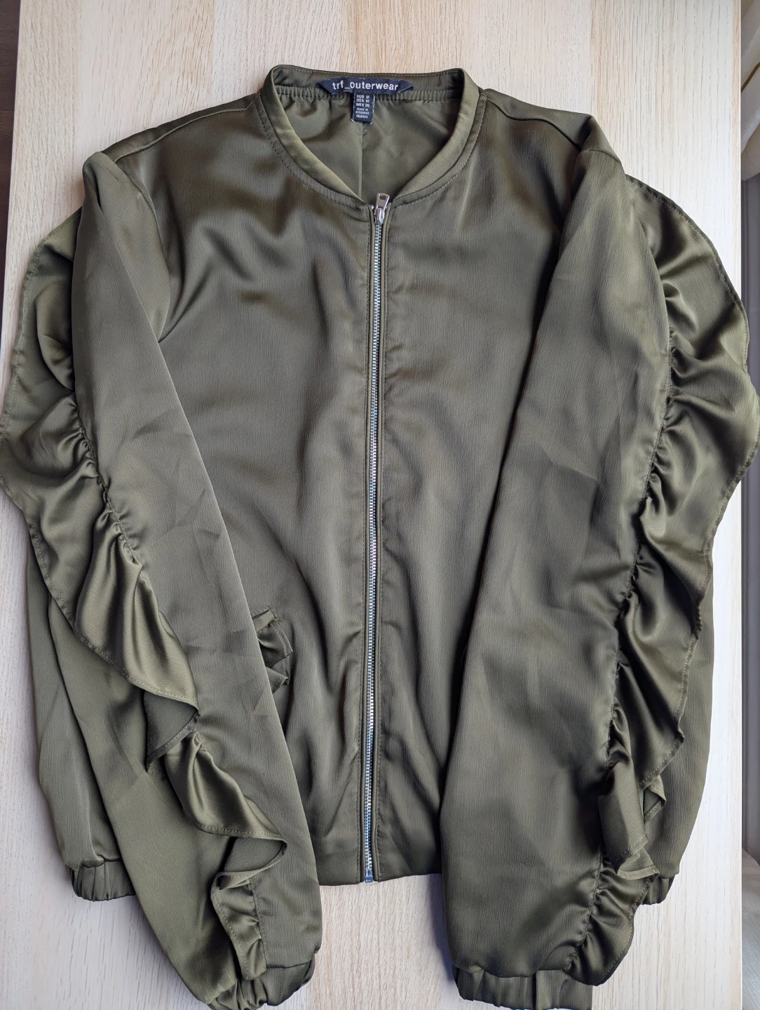 Olive green TRF Outerwear bomber jacket. It's a size medium with ruffled details on the sleeves and back, and a Satin matwrial.Front zipper closure.