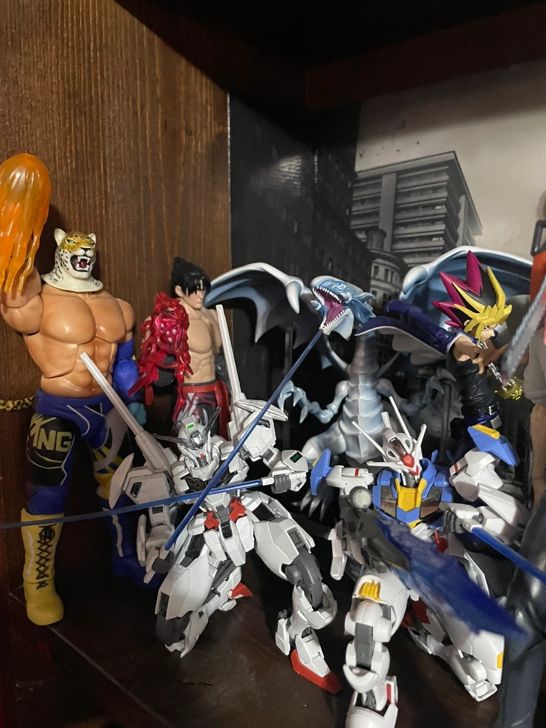 233 figures from Yugioh 70$ (yugi, blue white dragon, exodus giant action figure model kit Gundam 30$ for both Tekken king and Jin for 45 Ju jutsu kaisen itadori figure-25$ 125 for all