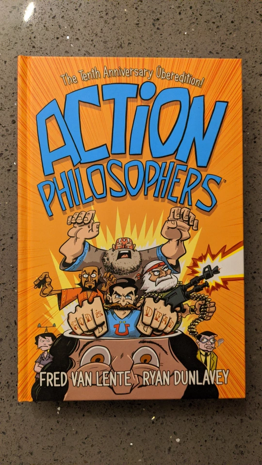 751Action Philosophers - Tenth Anniversary Überedition by Fred Van Lente and Ryan Dunlavey (Dark Horse Comics) Hard Cover Comic Book "This ain't your grandpappy's dusty old philosophy class! It's the philosophy seminar your college ethics professor wished he could teach! It's . . . the definitive tenth-anniversary edition of Fred Van Lente and Ryan Dunlavey's award-winning, best-selling Action Philosophers! Study the tenets of Plato, the wrestling superstar from ancient Greece, learn the lessons of Nietzsche, the original übermensch, and meditate on the messages of Bodhidharma, a kung fu master. Laugh, learn, laugh some more, and ponder the messages of history's great thinkers as Van Lente and Dunlavey deliver this comprehensive cartoon history from the pre-Socratics to Jacques Derrida!"
