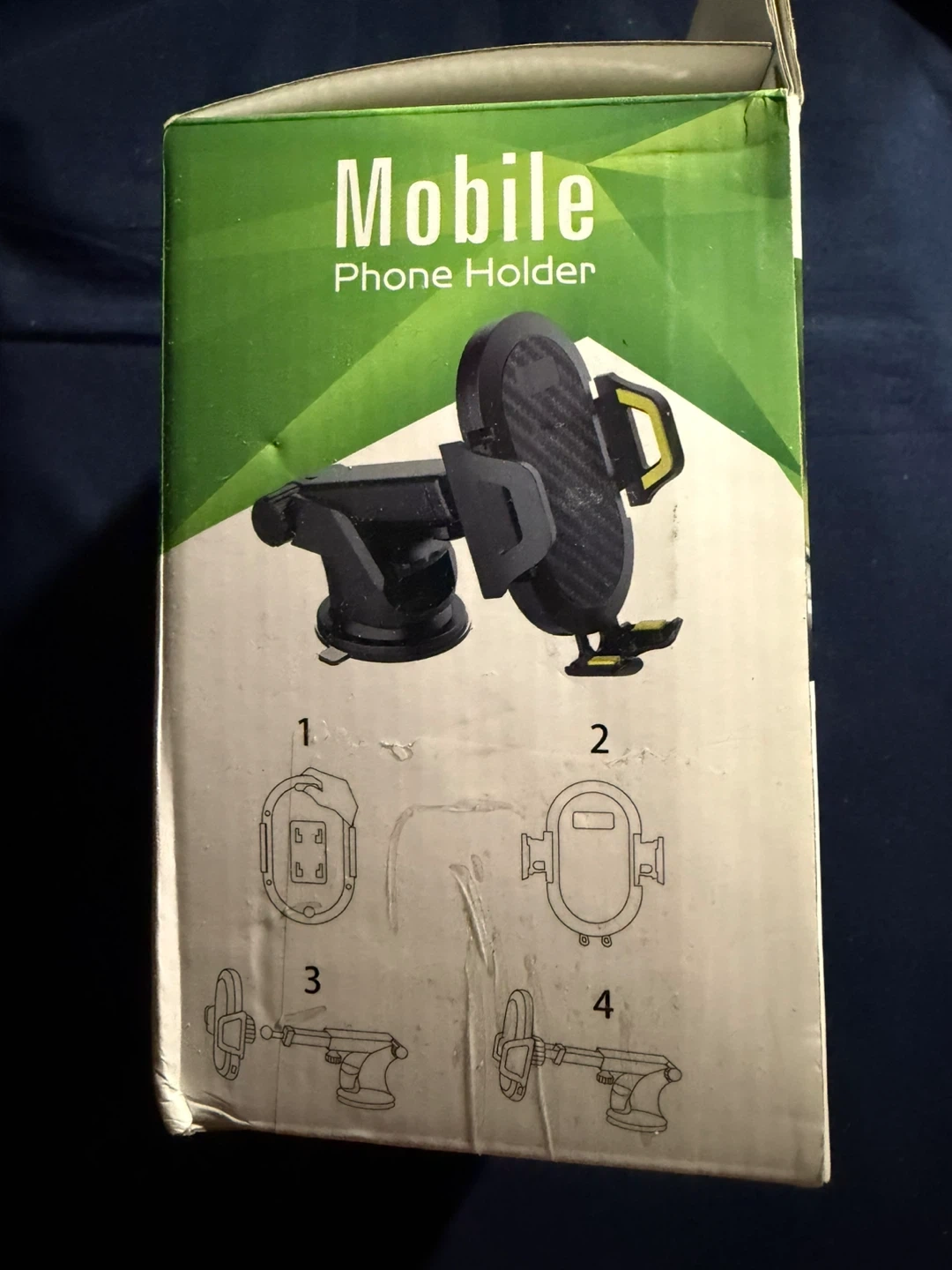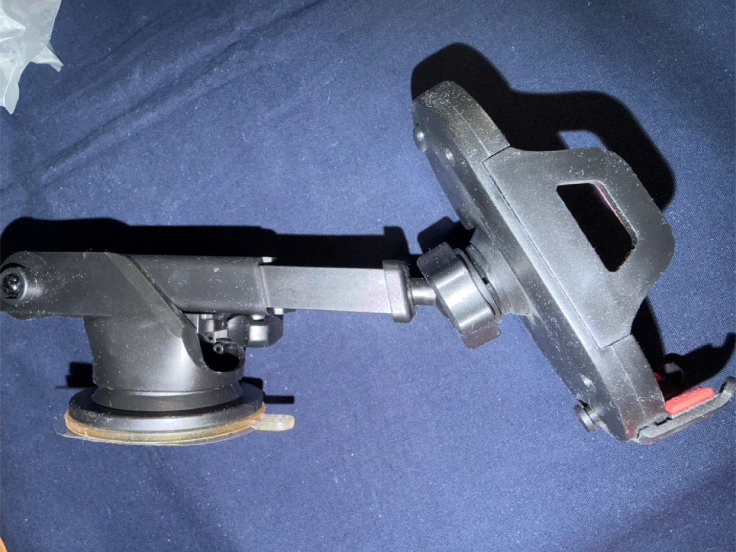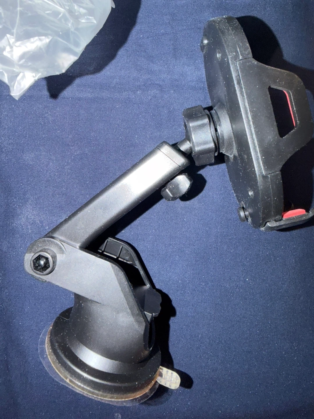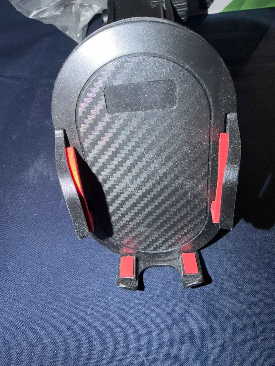 Single-handed operation mobile phone holder with 360-degree rotation. Compatible with phones, MP3 players, and GPS devices. It features a carbon fibre pattern design and suction cup mount. Red padded grips secure your device.