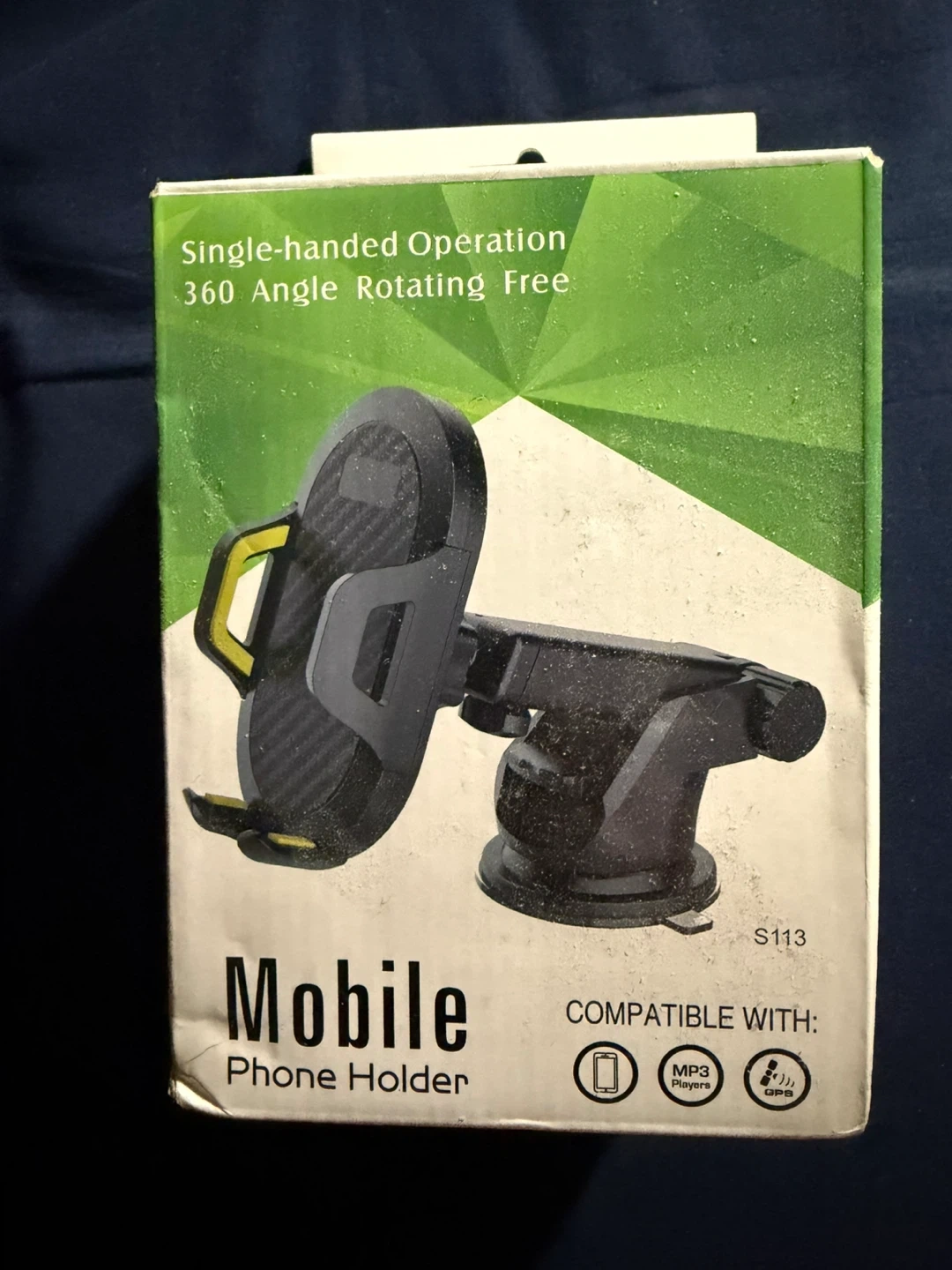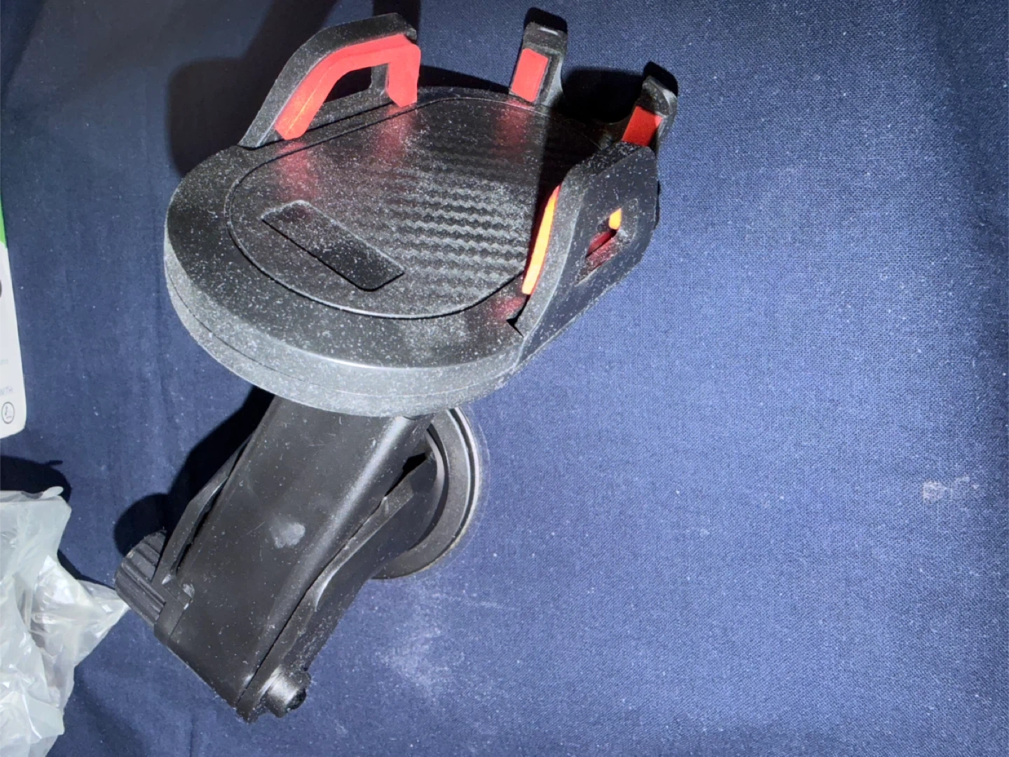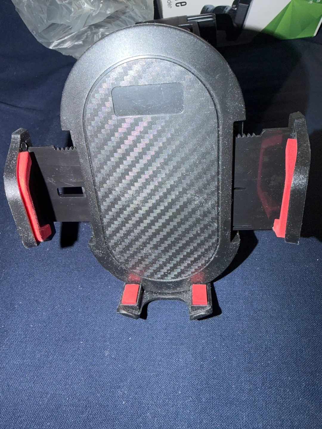 Single-handed operation mobile phone holder with 360-degree rotation. Compatible with phones, MP3 players, and GPS devices. It features a carbon fibre pattern design and suction cup mount. Red padded grips secure your device.