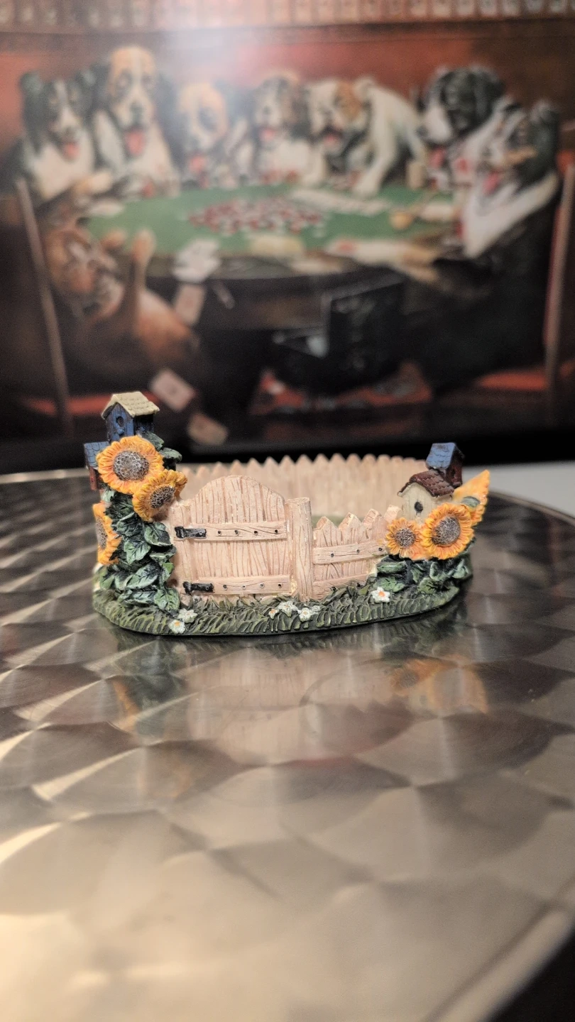 This charming trinket dish features a miniature farmhouse gate with sunflowers and tiny birdhouses. It's perfect for holding small jewellery or keepsakes. Made from resin, it has a rustic, decorative design.
