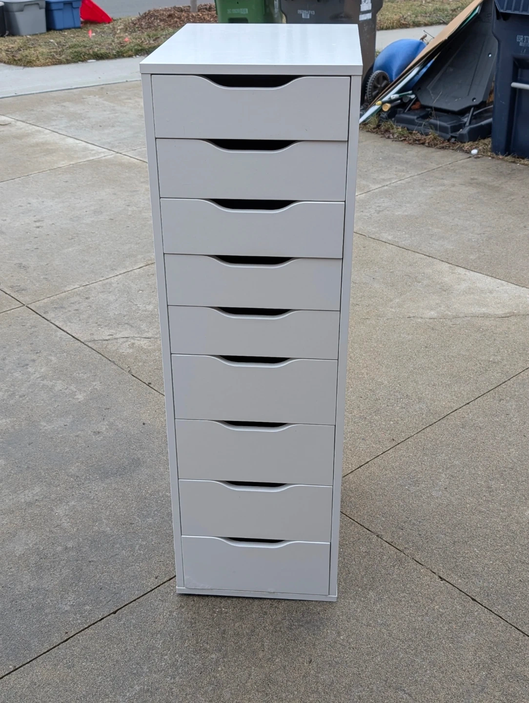 This is a white 9-drawer Alex unit, perfect for organizing art supplies or makeup. It's great for small spaces where you need extra storage. Its clean design fits well in any room.