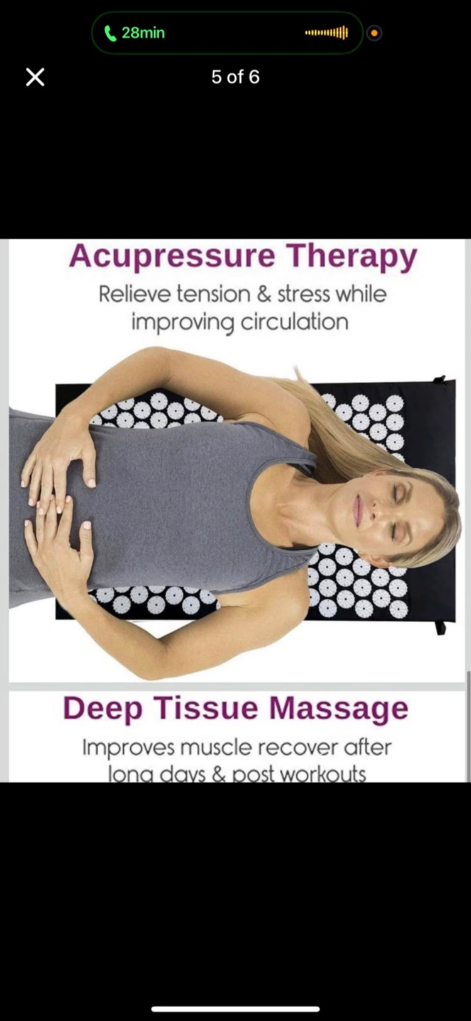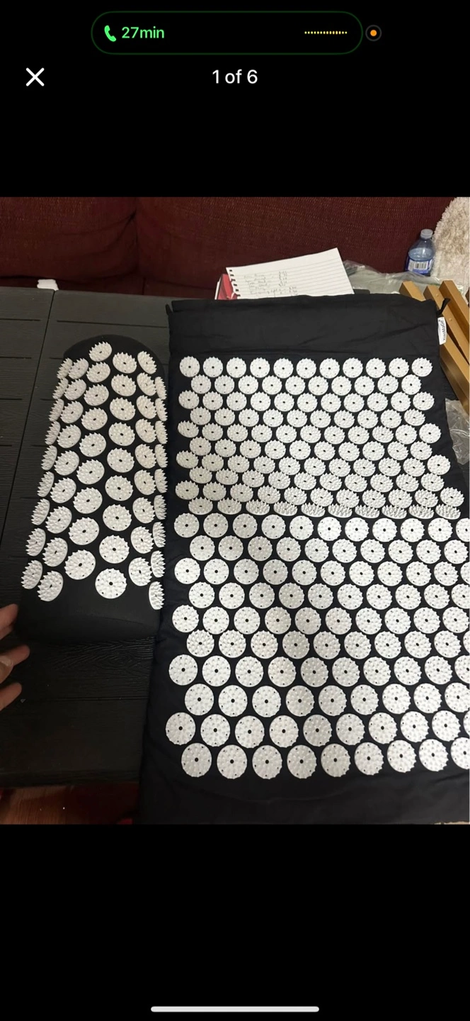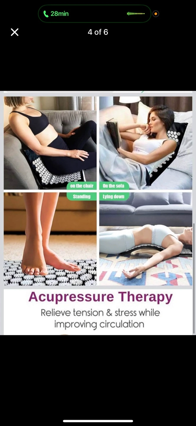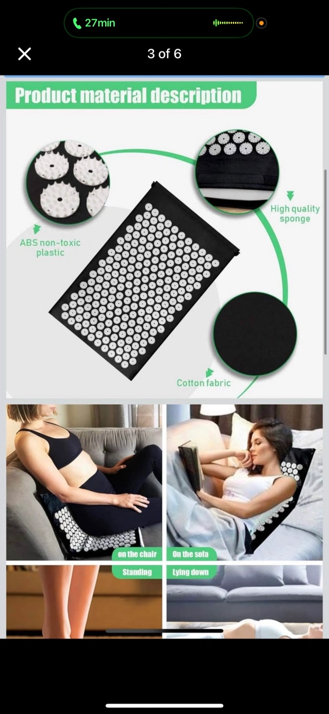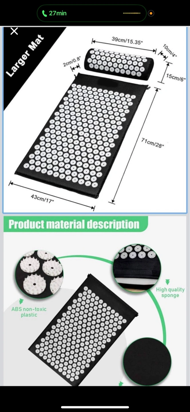 Acupressure mat and pillow set. Relieves tension and stress. Improves circulation. Deep tissue massage. Improves muscle recovery. ABS non-toxic plastic. High quality sponge. Cotton fabric. Use on chair, sofa, standing or lying down.
