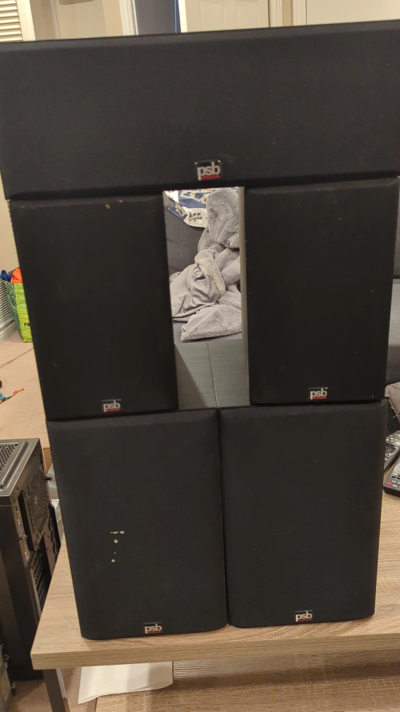 PSB surrounds and center are fine. Main drivers are shot but tweeter works fine. Sub took some damage in a move turns on and works sporadically so driver probably good, amp might be salvageable.