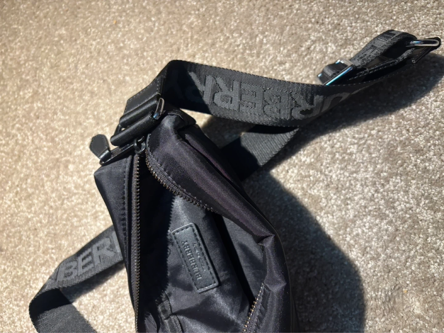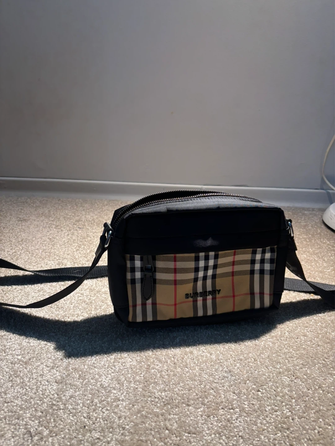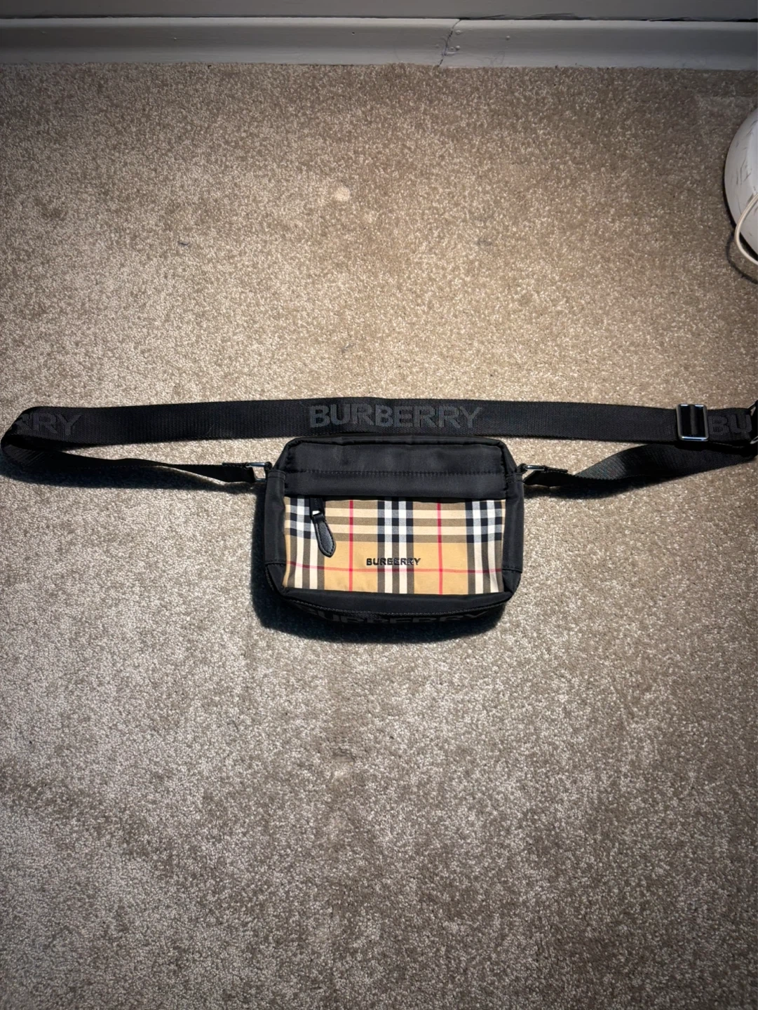 This is a Burberry black nylon crossbody bag featuring the iconic check pattern. It's a practical size for everyday essentials. The adjustable strap ensures a comfortable fit.