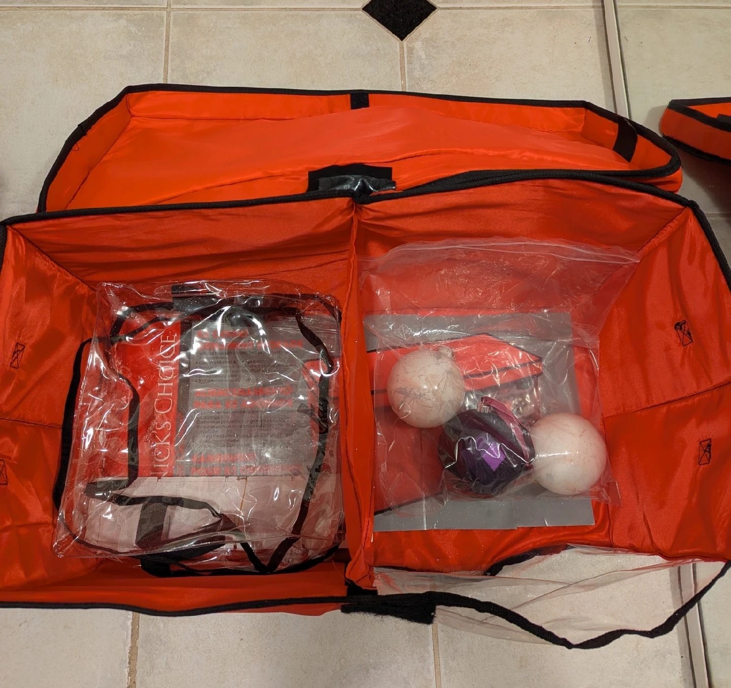 Christmas decorations storage box with lid. Inserts and dividers as shown. Includes 3 large ornaments.