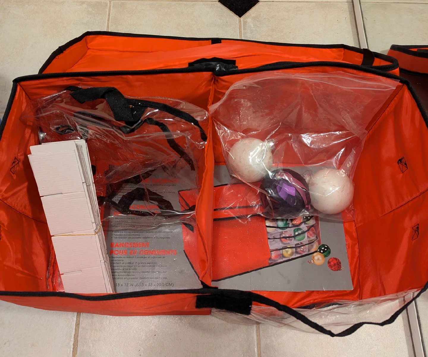 Christmas decorations storage box with lid. Inserts and dividers as shown. Includes 3 large ornaments.
