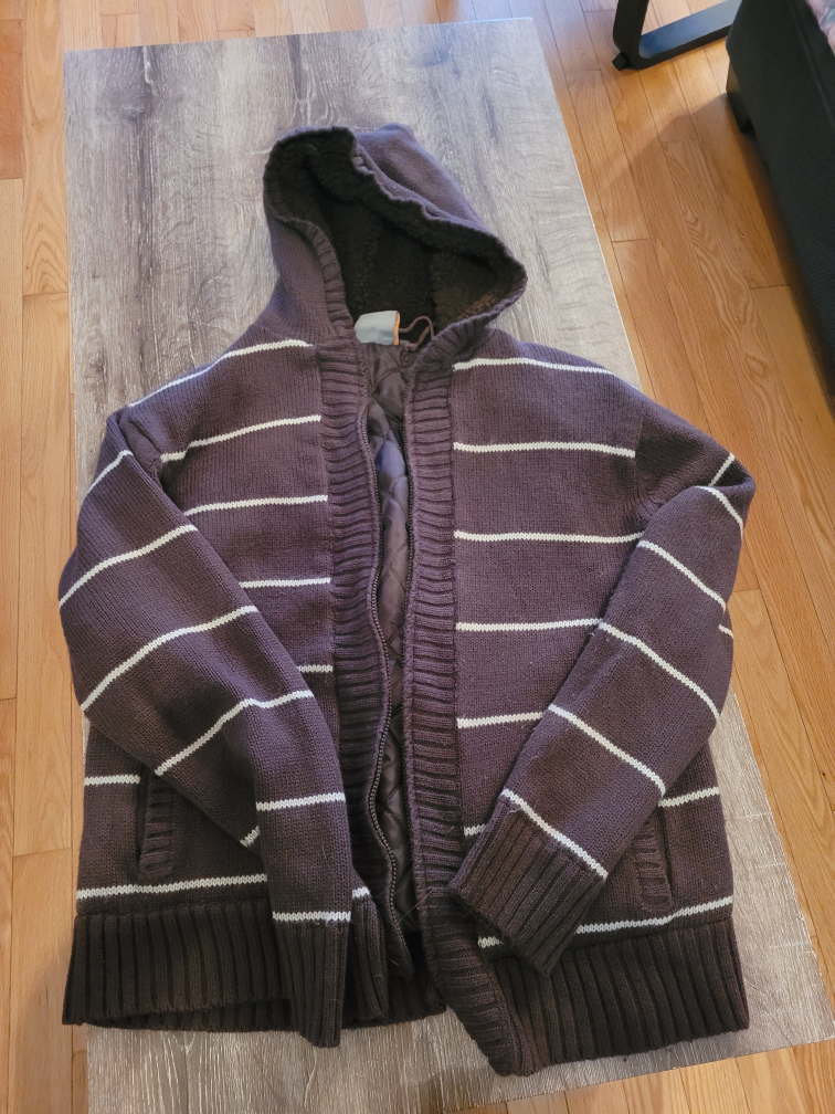 Men's brown and white striped hooded sweater. Features a zipper closure and fleece lining. Cozy and warm.