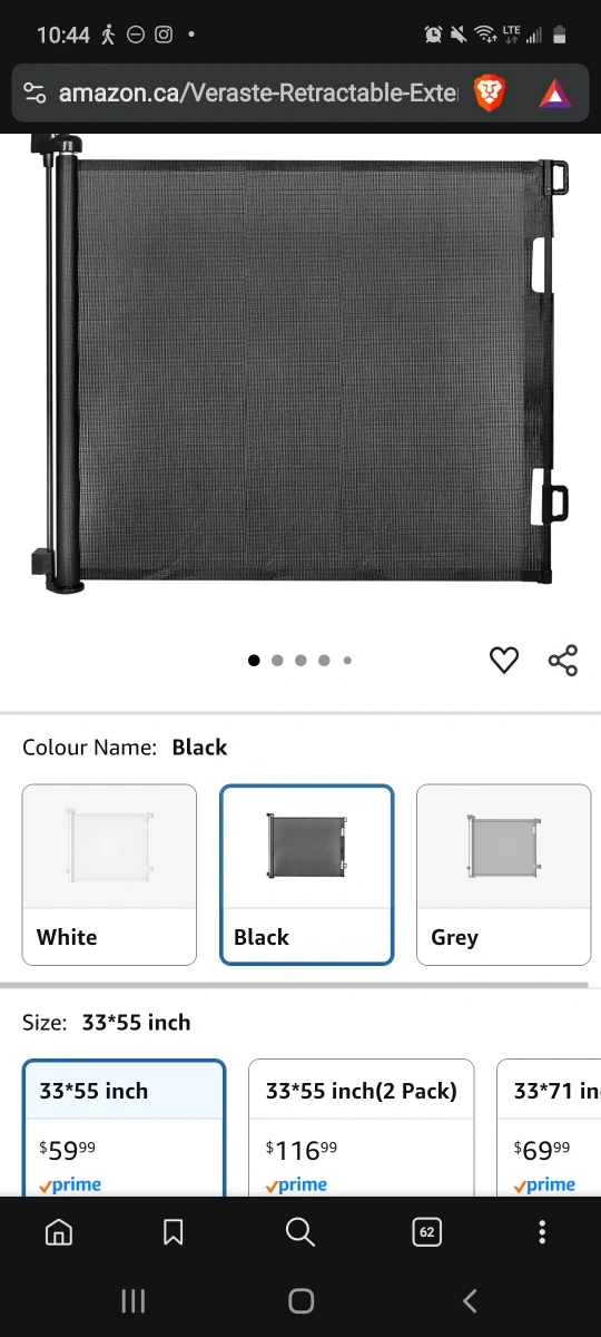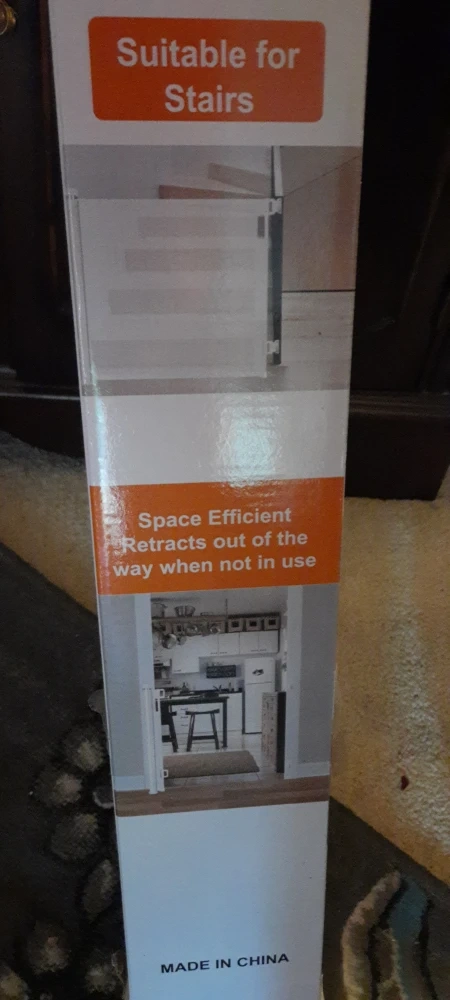 Selling a Veraste retractable baby gate in black. It's suitable for interior doors, outside use, and stairs. This gate is space efficient and retracts out of the way when not in use. The size is 33 x 55 inches. It originally sold for $59.99 and comes in the box!