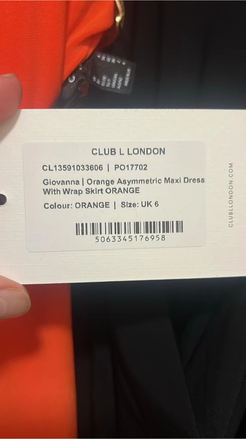Selling a Club L London Giovanna asymmetric maxi dress with wrap skirt in orange. It's a size UK 6. Perfect for a night out! Originally sells for 145$ currently out of stock on line so this is a once time opportunity to add this gorgeous dress to your wardrobe. Brand new, tag on never worn!
