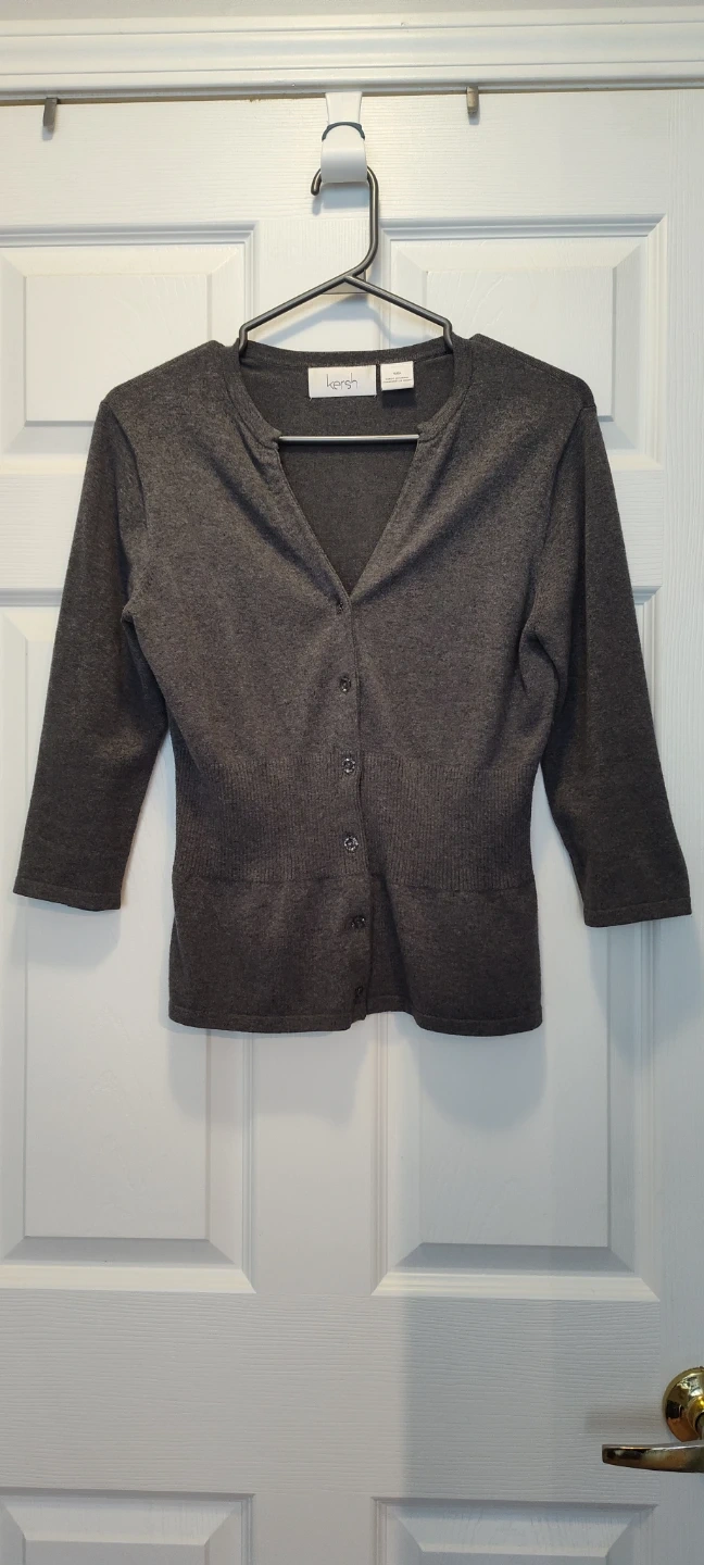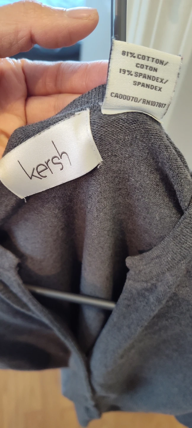 A charcoal grey Kersh cardigan with a V-neck and button closure. It's made of 81% cotton, 19% spandex. This sweater is great for layering over outfits.