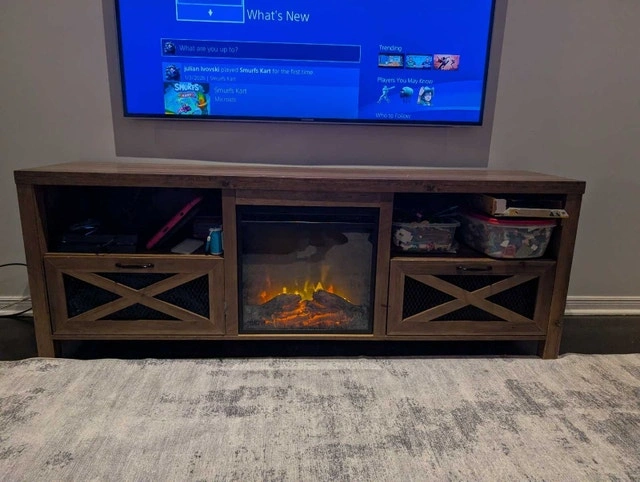 I'm selling a fireplace TV stand that combines functionality with a cozy aesthetic. This unit features a built-in electric fireplace, perfect for adding warmth and ambiance to your living space, and provides ample storage for media devices and accessories. The stand is designed with a rustic, wood-like finish and decorative mesh door fronts, making it a stylish addition to any room. Additional features include: Electric fireplace insert, spacious shelving and drawers, rustic wood finish, mesh door fronts, and cord management cutouts. This TV stand is in good condition and ready to be the focal point of your entertainment area! If the ad is up, it's still available! Cash accepted.