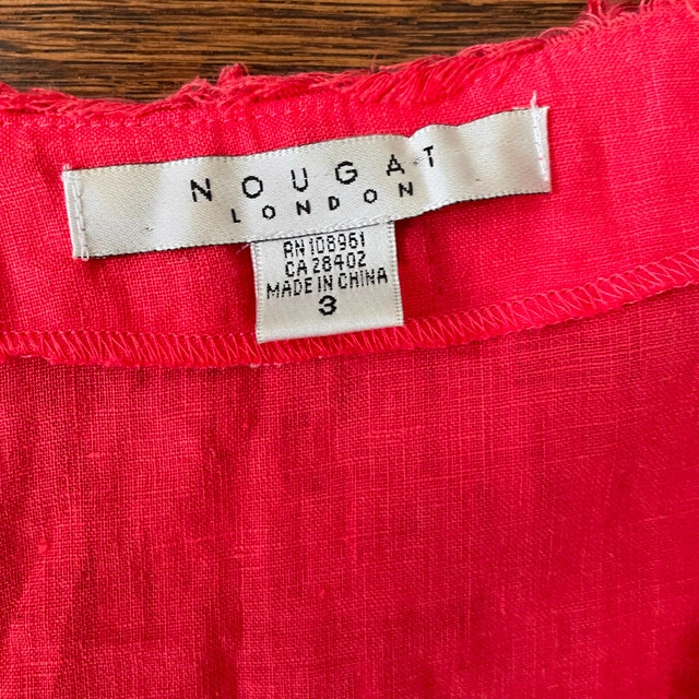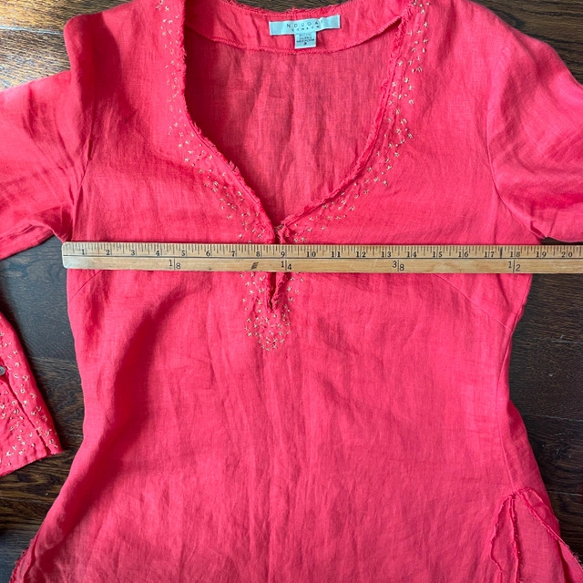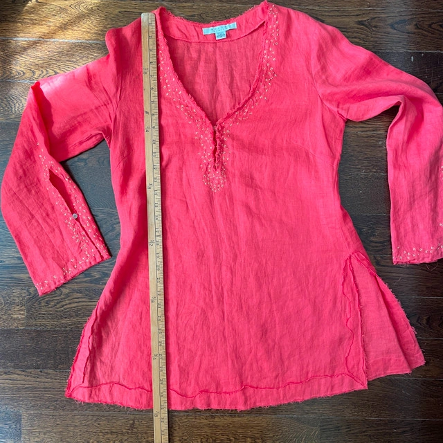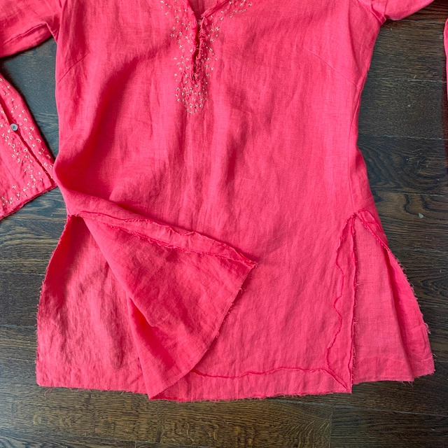 Selling a Nougat London Coral 100% Linen Tunic with Gold Stitching-Size Medium/Large. This has 2 side slits, decorative buttons at cuff. It's Nougat Size 3 which is close to a Medium Large.100% Linen. Gently used. Measurements lying flat: Pit to pit: 19" Length: 31.5" Asking $30. Available for pick up in the Broadview/Danforth area. Contact-free porch pick up. Check out my other great stuff!