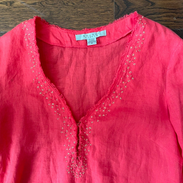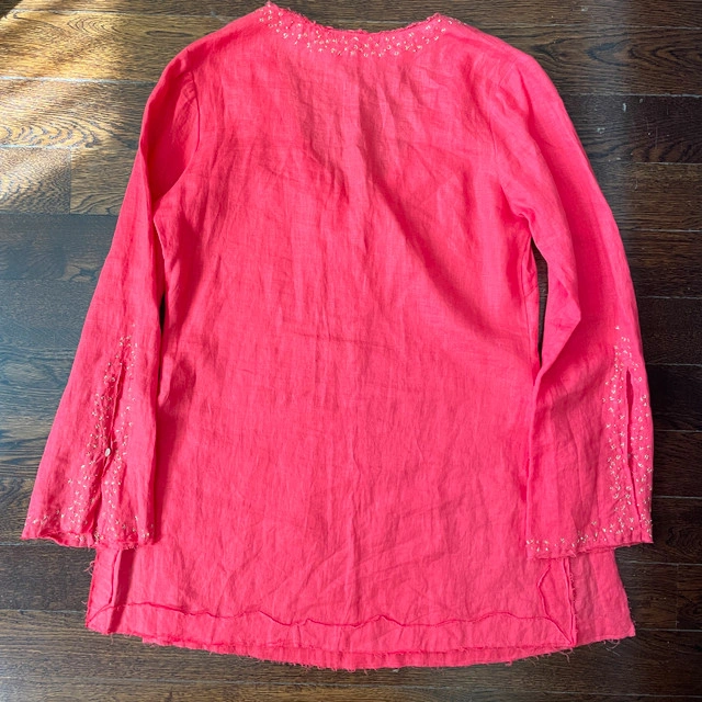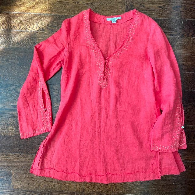 Selling a Nougat London Coral 100% Linen Tunic with Gold Stitching-Size Medium/Large. This has 2 side slits, decorative buttons at cuff. It's Nougat Size 3 which is close to a Medium Large.100% Linen. Gently used. Measurements lying flat: Pit to pit: 19" Length: 31.5" Asking $30. Available for pick up in the Broadview/Danforth area. Contact-free porch pick up. Check out my other great stuff!