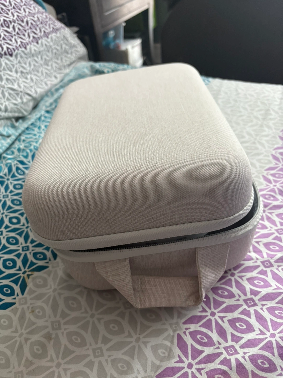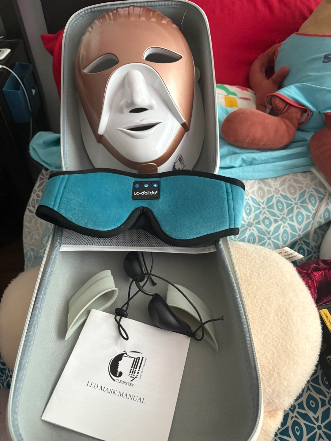 LED face mask with adjustable head strap. Includes a sleep mask and additional accessories. Comes in a convenient carrying case. Instruction manual included.